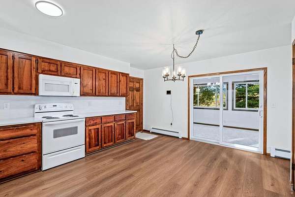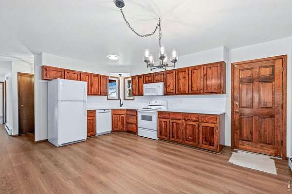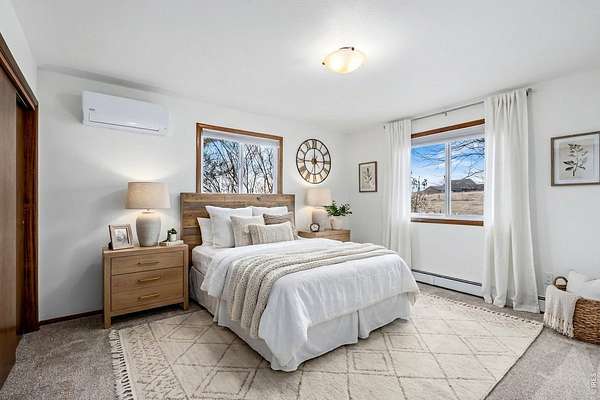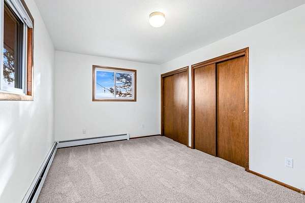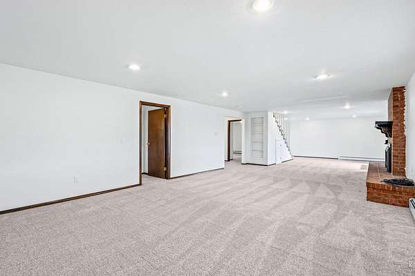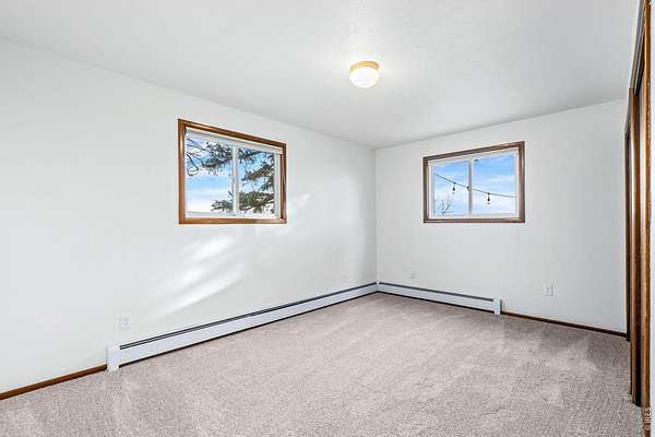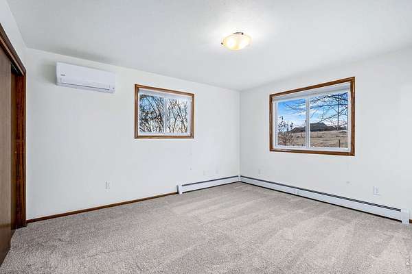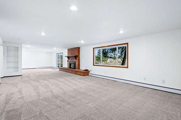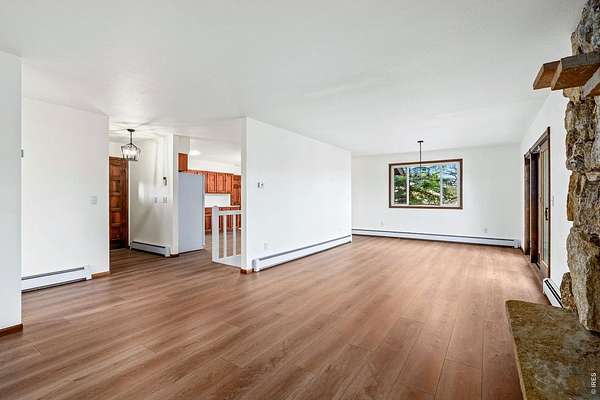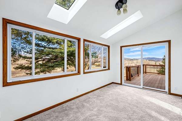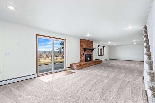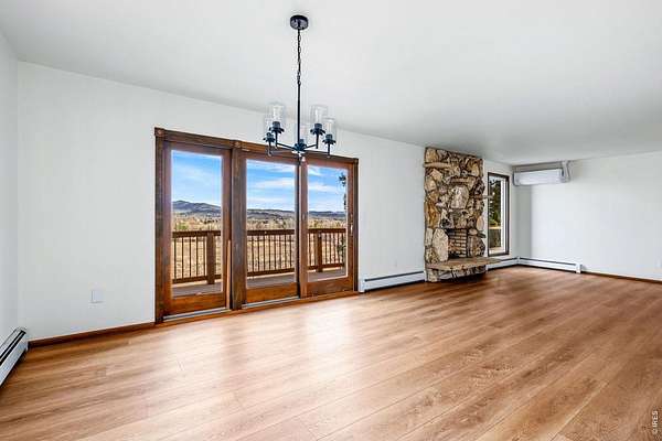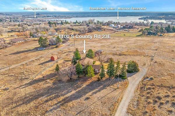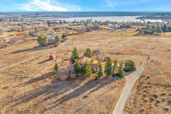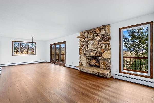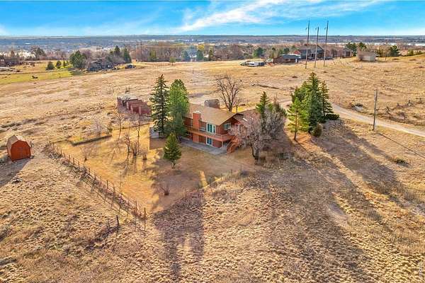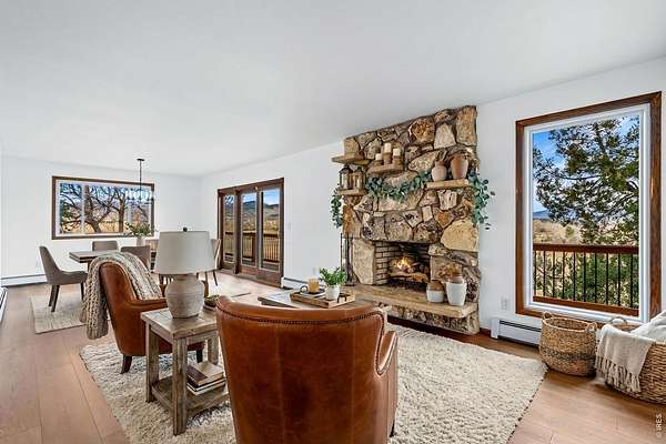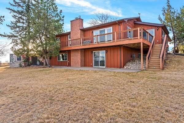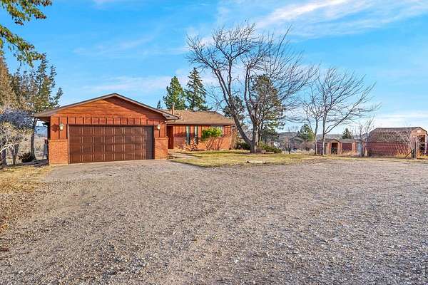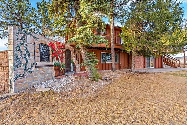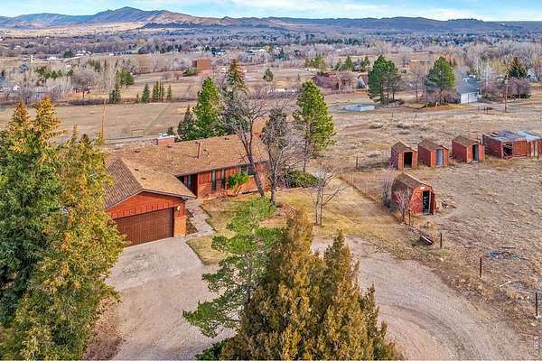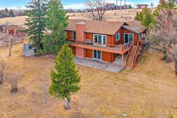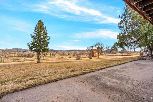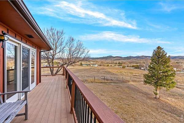 Set on nearly ten acres, this custom brick ranch frames the Foothills and Devils Backbone as your everyday backdrop, creating a setting that feels private, peaceful, and incredibly scenic from every angle of the property. Bright, well-defined living zones give this home a natural flow while still offering a sense of separation where it counts, making each space feel purposeful, comfortable, and easy to use day in and day out. The spacious living and dining area is anchored by a striking stone fireplace, creating a warm focal point, while sliding door access to the wraparound deck keeps the connection to the outdoors front and center. The kitchen offers ample prep space, generous storage, and room to add a breakfast nook or rolling island, all while flowing seamlessly into the sunroom for added light and versatility. Just off the kitchen, this light-filled space creates the perfect spot to relax, recharge, or enjoy the surrounding views in a more sheltered, year-round setting. Two main-level bedrooms each feature dual closets, while the primary suite includes its own ensuite bathroom for added convenience. Downstairs, the massive walkout basement offers endless room for recreation, hobbies, or additional living space, complete with a second brick fireplace and two more bedrooms that add flexibility for hobbies, guests, or multi-generational living. The wraparound deck captures sweeping mountain and acreage views, while the concrete patio creates a dedicated space for lounging, entertaining, or simply enjoying the quiet surroundings. The property is also set up for equestrian use or other outdoor pursuits with a loafing shed and pasture already in place, giving you the freedom to make the most of the land. Just minutes from Boedecker Lake for even more outdoor recreation, with easy access to shopping and dining.
