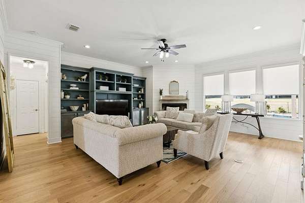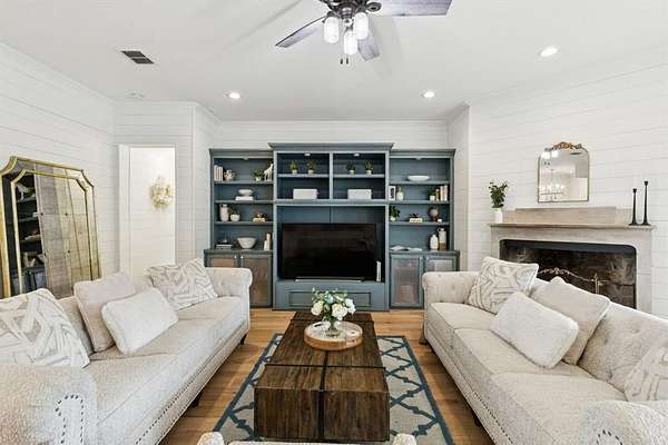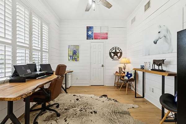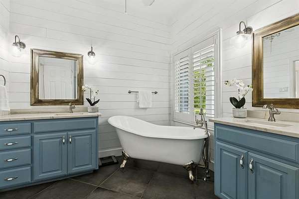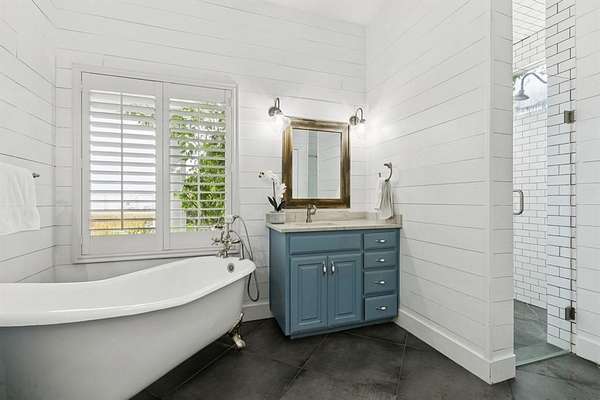 Inside, shiplap walls carry a warm and inviting character throughout the first floor. The kitchen is designed for both function and gathering, with a large island, a breakfast nook, and brand new appliances including a stove and dishwasher installed within the past year. Additional upgrades such as heated bidet toilets and a new HVAC unit have also been added for convenience. The living room centers around a cozy fireplace, while the downstairs study with barn doors provides flexibility as a home office or fourth bedroom. The primary suite is located on the main level with a spacious walk in closet and a relaxing bathroom featuring dual vanities, a clawfoot soaking tub, and a separate shower.