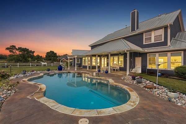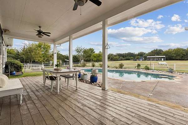 Set on 2.86 acres, this remarkable property offers a lifestyle that blends comfort and country charm. A private driveway with a gated entrance welcomes you home, where a stocked fishing pond with a dock becomes the centerpiece of the landscape. The grounds include multiple outbuildings such as a shed, a climate controlled dog kennel with AC and heat, an oversized chicken coop, and a three stall horse barn with tack room and attached RV carport. Raised garden boxes and mature fruit trees provide the opportunity to grow your own fresh fruits and vegetables, then cool off in the renovated saltwater pool just steps away from the covered back patio.