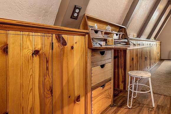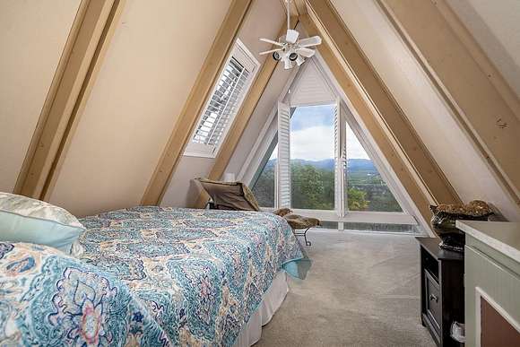 COUNTRY SETTING CITY CLOSE! This well maintained Gem is sitting on over 5 beautiful acres with stunning views from the large wrap around porch. It's a dream A-FRAME home featuring 3 bedrooms, 2 baths plus 367 sqft of additional finished basement space (above ground) with exterior access. The open concept center island kitchen offers newer cabinetry, ample storage, a pantry and plantation blinds. Main level: living room with built in cabinets to maximize space, new certified wood stove, primary bedroom, bathroom & laundry room. Two bedrooms up the spiral staircase plus walk in attic (bonus room) and second bathroom. Freshly painted exterior in 2024, new hybrid water heater installed in 2024, workshop area in garage, chicken coop, RV parking, a variety of trees & a seasonal creek + endless possibilities. You've got to tour this one of a kind, property in person.