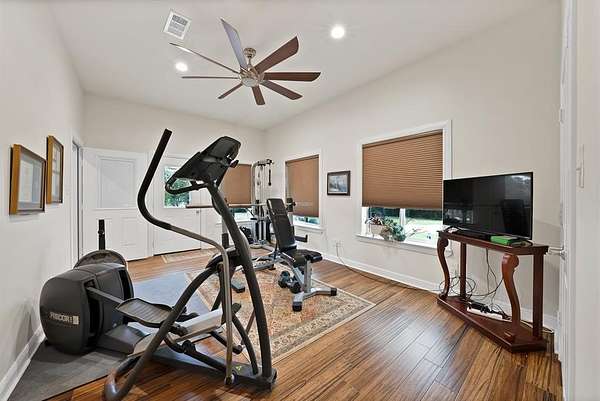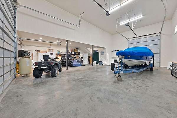 A separate barndominium adds tremendous value and versatility. It includes multiple bedrooms, a comfortable living area, and a full kitchen, making it ideal for guests, extended family, or short-term stays. The structure also offers pull-through boat or RV storage, providing convenient, covered access for large recreational equipment.