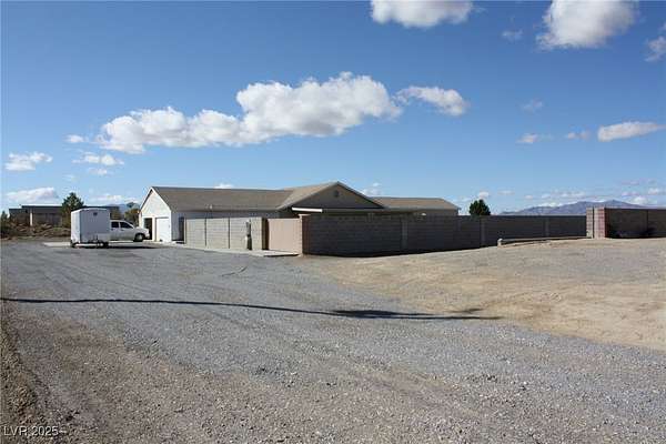 3 Bedroom home on approx. 8.71 acres in North end of Pahrump. 360-degree views of Pahrump Valley, Mount Charleston and other areas as well. Approx. 2540sf, single story, 3 full baths, 38x31 approx. house garage! no HOA! Private well with no fees. Separate RV garage (24X42) approx. with upper storage level built in. Also, a 2-car functional garage where well equipment resides. High ceilings, ceiling fans, solar panels, 20x30 approx. covered patio with ceiling fans, flood Lites. Fully landscaped yard with grass & auto sprinklers, Trees growing, newer paver fire pit, pavers galore! There is an approx. 150-foot garden with roses, vegetables, bubbler system all on auto timers, paver pathway lights, approx. 16x20 raised deck for backyard enjoyment! Front courtyard started for you to finish your way! Block walls around backyard, and some perimeter walls already up. Fruit trees, completely new roof in 2020, $20K extra Blocks & Boulders are available in right deal! Don't miss this!