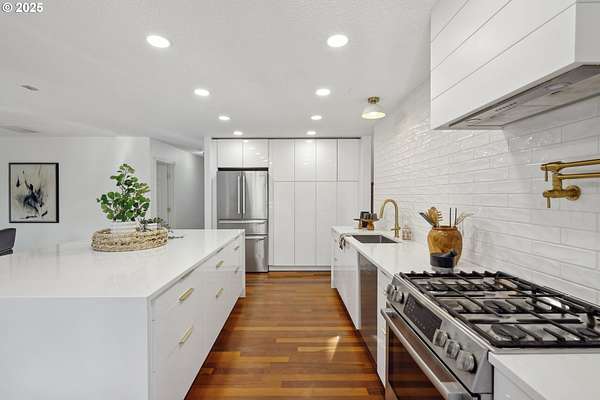 - Dishwasher, Free Standing Gas Range, Free Standing Refrigerator, Gas Appliances, Island, Microwave, Pantry, Plumbed For Ice Maker, Pot Filler, Quartz, Range Hood, Stainless Steel Appliance, Tile