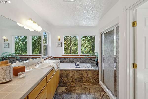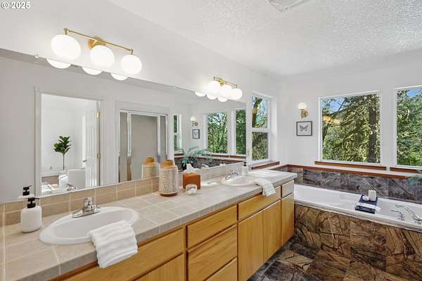 - Ceiling Fan, Garage Door Opener, Hardwood Floors, High Ceilings, Jetted Tub, Laundry, Slate Flooring, Tile Floor, Vaulted Ceiling