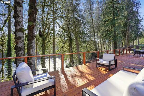 10 min to town. No flood insurance is needed on this property. Right on the Sandy River, this stunning 2-story home blends charm with modern convenience. Built in 2000 and thoughtfully updated, this home offers soaring ceilings, an open circular layout, and breathtaking river views guaranteed to wow all. Step into the bright and airy formal living and dining areas where massive windows flood the spaces with natural light. The hardwood floors provide warmth and elegance. The gourmet kitchen is a chef's dream, featuring new stainless steel appliances, a massive quartz island with an eating bar, a dual fuel range and range hood, and a cozy breakfast nook with deck access. Enjoy the perk of having a scullery/butler's pantry convenient for washing dishes, or as an overflow kitchen. The adjacent family room completes the heart of the home, boasting hardwood floors, a gas fireplace, and an inviting atmosphere perfect for gatherings. The main level also includes a bedroom and a full bath for coveted single level living and multigenerational opportunities. Upstairs, the primary ensuite is a luxurious escape, offering hardwood floors, a walk-in closet, convenient laundry, huge bath with double vanity sinks, a steam shower, and a spa-like bath with a jetted tub overlooking the river. Two additional bedrooms share a well-appointed full bath. There is a 3 car garage with a shop/work space. The absolute showstopper of this property is the unparalleled riverfront setting and the quality of life it provides. Relax on your private deck with personal river access. Enjoy fishing in the water below or just soak in the serene beauty of the river. The 2x6 home construction provides greater structural integrity and additional energy efficiency. New HVAC/heat pump, a newer metal roof, a newer deck and railings, newer fiber optics, 2 water heaters, and refinished floors provide years of future enjoyment.