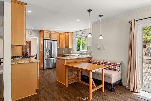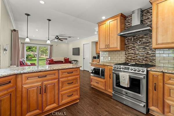 The thoughtfully updated kitchen features granite countertops, farm house sink, stainless steel appliances, upgraded cabinetry, and opens seamlessly to a view towards the backyard through the sliding doors —creating an ideal layout for both everyday living and entertaining. The main level flows effortlessly between the kitchen, dining, living, and family areas, making gatherings easy and enjoyable.