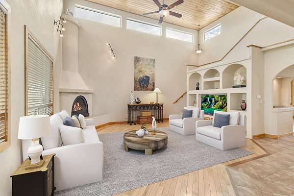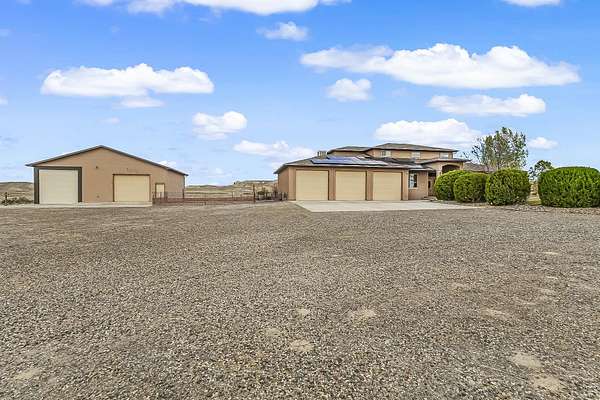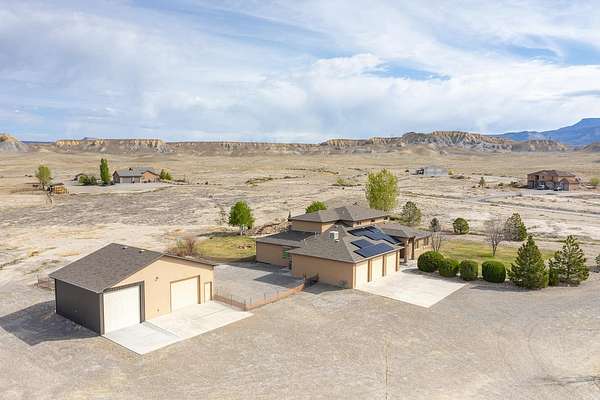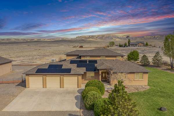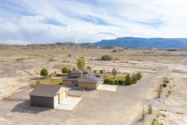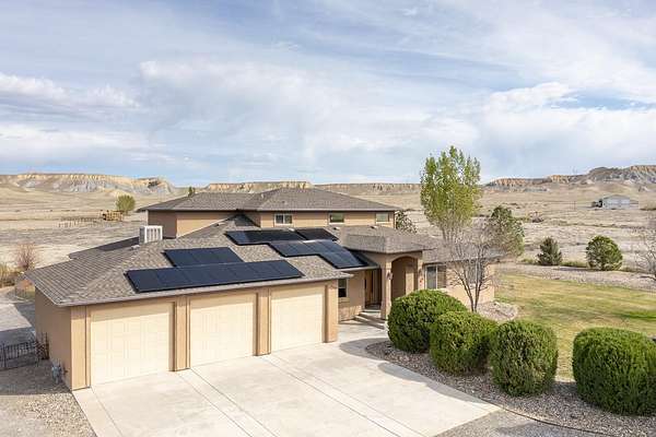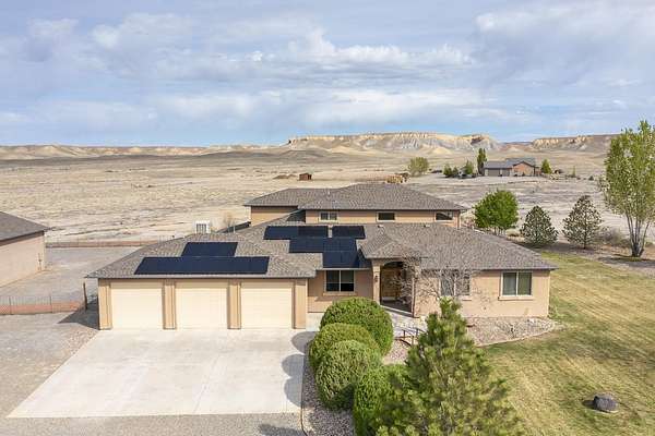 Wow! This kind of property does not come along very often! There are 8 acres with plenty of views and privacy with access to public lands for hiking, biking, horseback riding, and four-wheeling. This home includes 4 bedrooms, an office/music room, 3 bathrooms plus a 1/2 bath in the 3 car attached garage. In addition, there is a large detached shop with RV parking and hookups. The kitchen is amazing and equipped with a gas range/oven, built in oven and microwave, trash compactor, lovely pot rack, gorgeous granite countertops, large pantry, and an informal eating area. there is a large formal dining room, a great room with soaring 20 ft wood ceilings, kiva gas fireplace, entertainement center with large screen TV, oversized Alder wood doors throughout, hardwood and tile flooring, and lots of view windows. The loft area is complete with a wet bar, refrigerator, a guest bedroom, and a 3/4 bathroom. The energy efficient solar panels are owned, and there is central A/C, and tankless water heater. Enjoy summers on the lovely covered patio with misters and gas spigot for BBQs. There is irrigation water through the HOA for landscaped areas. Beautiful country setting, yet only 15 minutes from downtown Grand Junction and the City Market.