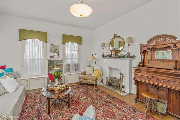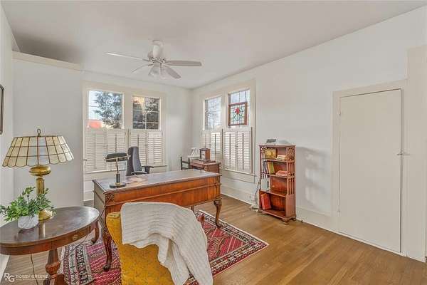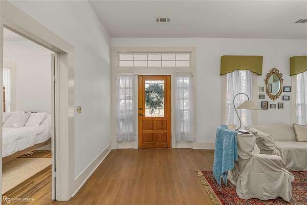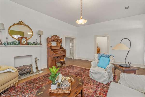 The home welcomes you with a charming front porch and an inviting entry that opens into a spacious living area featuring a gas log fireplace. Inside, you'll find 10-foot ceilings, large double-pane windows that flood the home with natural light, and original hardwood floors that have been recently refinished. Notable updates include new sheetrock, fresh interior paint, a new roof, central heating, and electrical upgrades, blending historic character with modern improvements.