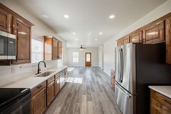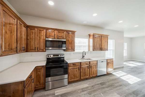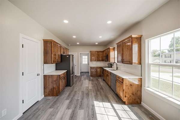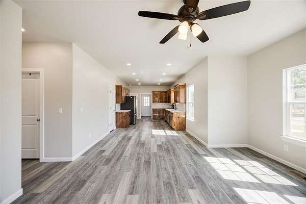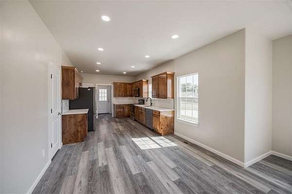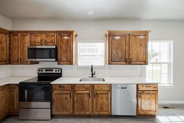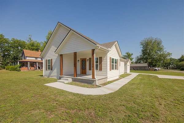 Welcome to your beautiful brand new construction home in historic Guthrie, OK! This home is across the street from the brand new park and down the street from the elementary school! This home has many of the attributes of an original quaint Guthrie home with all new design elements. Come by and see this 3 bed/2 bath home on a double corner lot with a side entry, detached garage. The great room has a wonderful open concept through the living room, dining room, and kitchen with lots of natural light. The kitchen and bathrooms have beautifully stained wood cabinets that you won't get in many new builds and beautiful quartz countertops that take this design to the next level. Bright white and stained woods inside and out make this beautiful home so inviting! This house has a massive yard with 5 ton AC unit! Refrigerator, washer and dryer come with the home! Don't miss out on your new home!