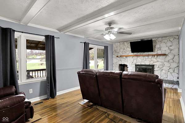 Situated at 11021 N Paddock RD S in Mooresville, IN, this single-family residence presents an inviting home, ready for immediate enjoyment. The interior living experience begins in the welcoming living room, offering a comforting ambiance with a warming fireplace and an impressive, beamed ceiling that adds distinctive character. The kitchen presents a convenient kitchen bar and a functional kitchen peninsula, all complemented by natural light flowing in from the kitchen windows. This home spans 2852 square feet across two stories, with five well-proportioned bedrooms that offer private retreats. Outdoor leisure is effortlessly embraced with a welcoming deck and a comfortable patio, both perfect for moments of relaxation. The generous lot, encompassing nearly 2 acres, includes a fenced backyard, providing a serene outdoor environment. Practicality is further enhanced by a dedicated laundry room. This property offers a harmonious blend of comfortable interiors and expansive outdoor opportunities!