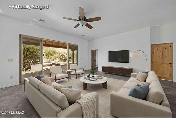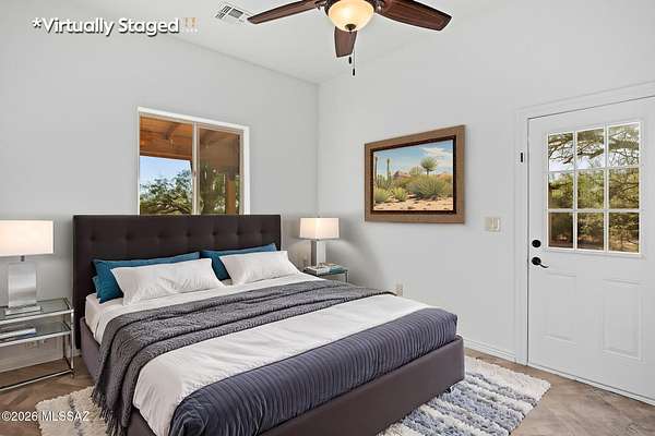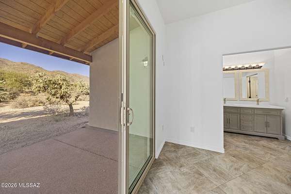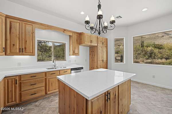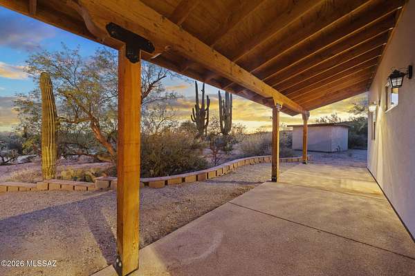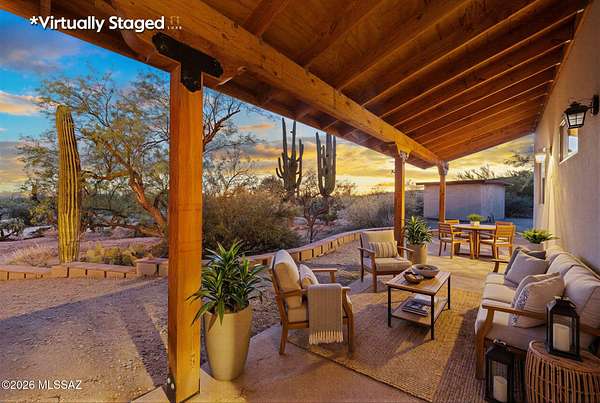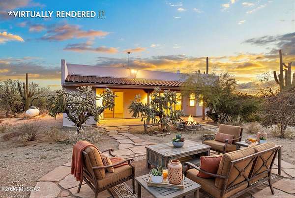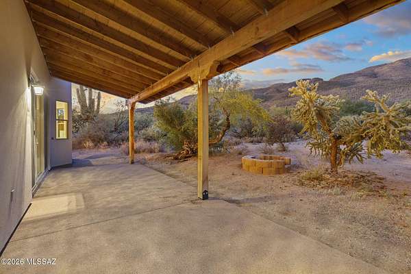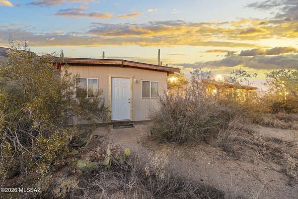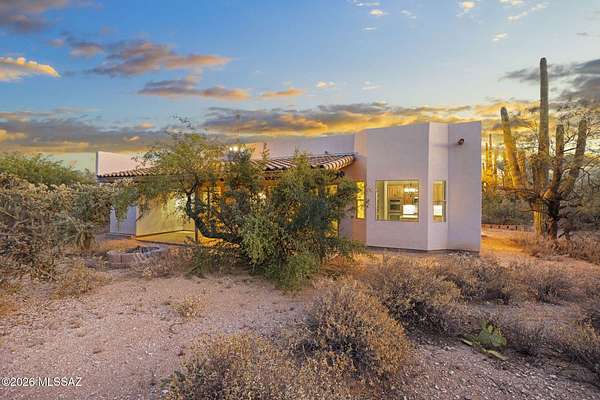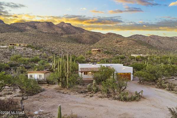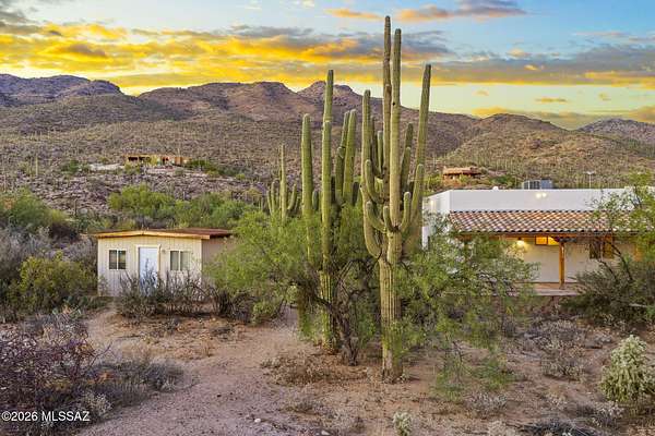 Tucked into the Sonoran Desert foothills at the base of the Catalinas, this 2019-built modern Territorial delivers what buyers spend months searching for: unobstructed mountain views, total privacy, and a setting no subdivision can replicate. The open kitchen features knotty alder cabinetry, granite countertops, a center island, double wall ovens, gas cooktop, and stainless appliances. The great room opens through full-wall sliding glass doors to a covered wood-beam patio with the mountains as your backdrop. 3 bed, 1.5 bath, 1,477 sq ft, 2-car garage. No HOA. covered patio and natural fire pit area invite outdoor living among mature saguaros and native desert. An additional outbuilding on the property adds storage or hobby space. Built in 2019 with newer systems throughout. Located minutes from Tanque Verde Road with easy access to Tucson amenities while maintaining that true desert escape feel. Properties in the 85749 corridor with this setting and build year move fast. Come see it.