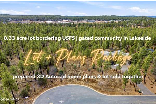 This is more than just land; it's a rare blend of luxury seclusion, modern conveniences, and breathtaking natural surroundings in a secure, gated setting. This beautiful and buildable, level lot offers a unique opportunity to build your dream home with plans being sold with the lot purchase, saving you months of design work and allowing you to break ground faster. Fully drawn and ready for the buyer to select a builder and apply for permits. Your very own modern mountain magnificence - offering a 3,255 (livable) sq foot residence thoughtfully designed in 3D Autocad to accommodate for all the desirable aspects and touches. Not only does this package give you a significant head start and dramatically speeding up your build time, but the lot itself has much to offer. Surrounded by natures finest offerings, close to Big Spring and Walnut Creek you'll have the opportunity for nature and wildlife right out of your backdoor. Nestled directly bordering US Forest Service land this property provides unparalleled privacy with the serene presence of towering pines, streams and lakes nearby. This quiet neighborhood offers a charming covered bridge gated entry and is fully equipped for easy development with paved streets and utilities at the property line. This location is close to hiking trails, Big Springs Trail, White Mountain Nature Center, as well as restaurants, shopping and community activities. Don't miss your chance to own this exceptional piece of paradise - perfect for your custom home, mountain retreat and forever escape.