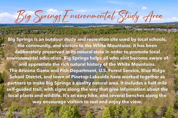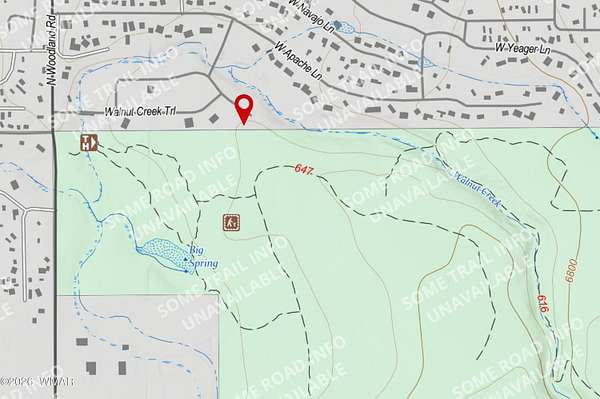 From White Mountain Blvd (hwy 260) turn onto Woodland Rd, Turn onto Walnut Creek Trail to entrance of The Retreat at Walnut Creek subdivision. Covered Bridge and gated entry. Once through gate follow Walnut Creek Trail until it Ts with W Big Springs Trail. Turn Right onto W Big Springs Trail, Sign.