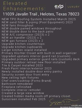 Discover country living in this newly updated house from the floors to the ceiling, within a few miles from 1604 and less than 10 miles from the I-10 freeway. Appraisal exceeded the listing price - instant equity built in. A home warranty is included up to $500. The vast acreage provides MIL suite potential for guests or aging family, offering flexibility for a variety of living arrangements. The backyard is a private paradise with a relaxing in-ground pool, a new sand filter, and piping for easy maintenance. Enjoy year-round outdoor living on expansive decks and generous space for gardens, animals, or a homestead. Best of all, there's no HOA, so you can truly make this your own country estate. This newly updated 4-bedroom, 3.5-bath home sits on nearly 2 acres, offering a private retreat with easy access to everywhere you need to go. With over 3,000 sq ft of living space, the home features fresh paint, new tile, plush carpet, and an open, bright layout. The chef's kitchen shines with sleek new countertops, an oversized island, and top-of-the-line Forno appliances. Energy-smart upgrades include new A/C units, energy-efficient windows, and a modern Metal TPO roof. The primary suite is a luxurious retreat that is upstairs with His & Her closets, a media room, and access to outdoor decking, perfect for unwinding in style. Come see this exceptional home and fall in love with the combination of luxury, privacy, and endless outdoor living-with the convenience of city access just moments away. Schedule your tour today and envision your future here.