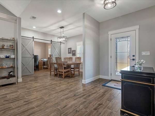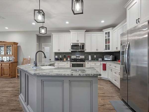 Experience comfort and space in this thoughtfully designed home on 2.5 acres. A welcoming covered front porch opens to an open-concept layout ideal for everyday living and entertaining. Plantation shutters and dimmer switches add style and customizable ambiance throughout. The island kitchen offers ample counter space and a pantry, flowing into the formal dining room and cozy breakfast nook. A dedicated office provides an ideal work-from-home space. The split bedroom plan ensures privacy, with a spacious primary suite featuring a large walk-in closet, dual sinks, a soaking tub, and an oversized shower. Additional features include a double attached garage, a Generac whole-house propane generator, and an active Terminix maintenance plan with bait stations. Outdoor amenities include a 49x30 open-space barn with security lighting and a 20x40 enclosed building with 10' roll-up doors and 220 power—perfect for storage, hobbies, or projects.