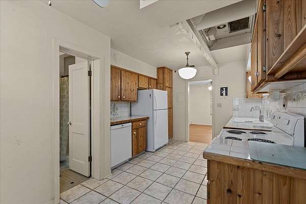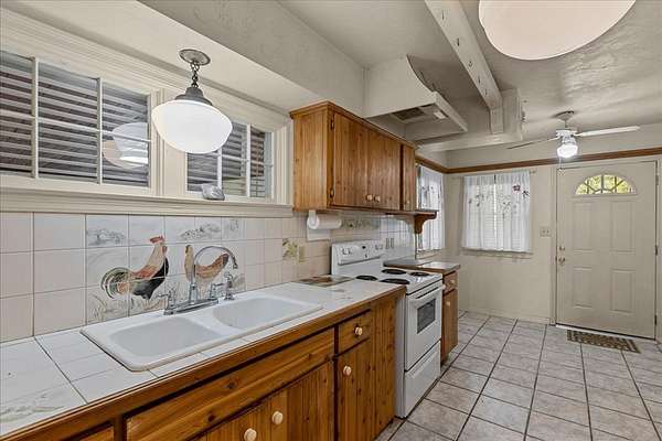 - Electric Range, Family Room, Fireplace, Laundry Tub, Laundry/Utility Room, Living Room, Tile Counter, Wood Cabinets, w/ Hookups