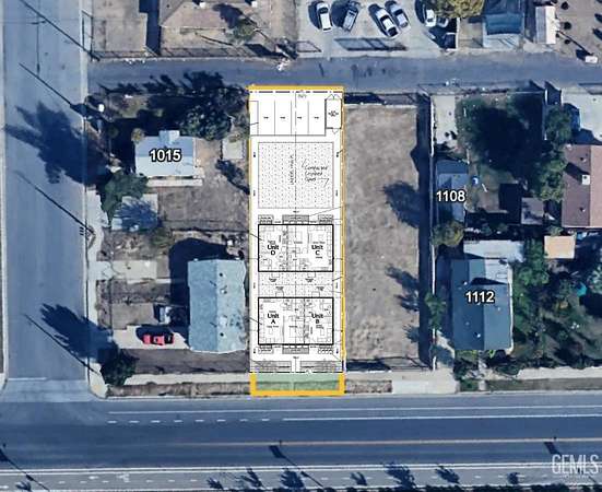 Est $915/moPrime infill opportunity in Bakersfield. 7,405 SF C-1 zoned lot offered with ready-to-issue plans for two duplex structures (4 units total). Each duplex includes one 1-bedroom unit and one studio, providing an ideal small-unit rental mix. Alley access incorporated into site design for parking and circulation. Plans, site layout, and elevations complete saving time and design costs. Excellent opportunity for investors or builders seeking a shovel-ready 4-unit project. Buyer to verify with City. Seller may carry.