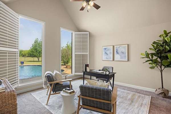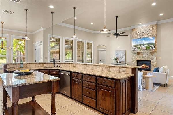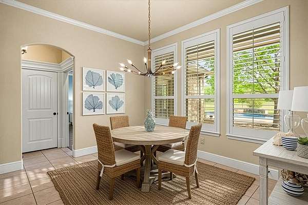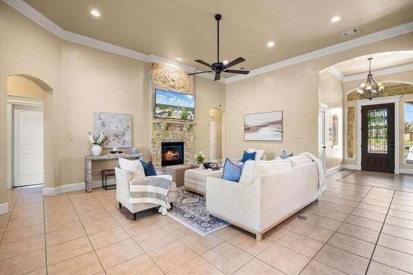 Located in the prestigious, gated community of The Peninsula, this exceptional single-story estate offers over 4,000 square feet of thoughtfully designed living space with room for everything. Featuring 6 spacious bedrooms and 5 bathrooms—including a Jack-and-Jill layout between 2 bedrooms—each bedroom enjoys convenient access to its own bath, providing comfort and privacy for family and guests alike. The open-concept living area impresses with soaring ceilings, expansive windows that flood the space with natural light, and a stunning floor-to-ceiling rock fireplace as the focal point. The chef’s kitchen is equally remarkable, showcasing a wraparound bar island, gas cooktop, built-in refrigerator, and gorgeous custom cabinetry. A breakfast room just off the kitchen and a formal dining room ensure effortless entertaining for both everyday living and special occasions. The oversized primary suite is a true retreat, complete with a sitting area and a see-through fireplace that opens to the luxurious en-suite bath—creating a spa-like atmosphere. Step outside to your own private oasis on 2.3 acres, where mature landscaping, a secluded courtyard, and a covered porch overlook a sparkling pool with a waterfall feature—perfect for relaxing or entertaining. Additional highlights include a detached 2-car garage (for a total of 5 garage spaces), a dog washing station in the garage, second refrigerator in the mudroom, washer and dryer, five mounted TVs, and a water softener system.