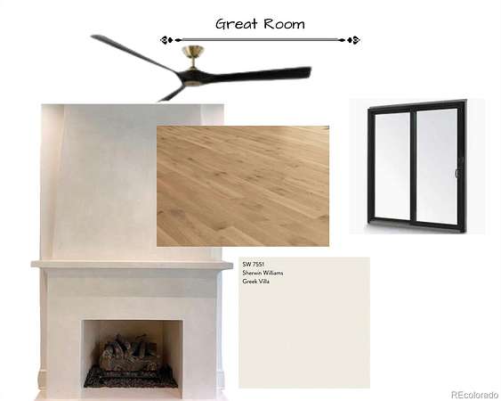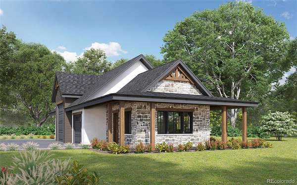 A stunning courtyard-style entry with stonework and outdoor fireplace sets the tone, leading to a covered front porch and into a light-filled interior. Inside, a glass-enclosed home office provides the perfect remote work space, while the vaulted great room with fireplace anchors the home with warmth and architectural detail. The open-concept layout flows seamlessly into the dining area and out to a covered deck with sliding glass doors, ideal for Colorado indoor-outdoor living.