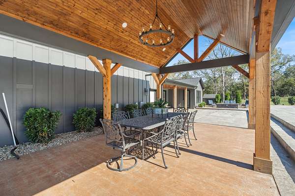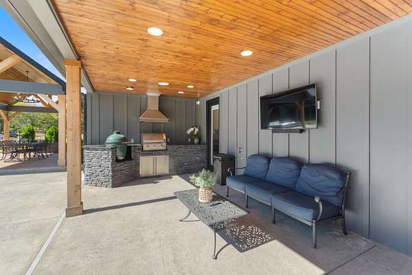 Outdoor oasis includes an expansive 42x15 heated saltwater pool, stamped concrete decking, outdoor kitchen with Green Egg smoker & commercial grill. Covered pavilion with wood ceiling detail for outdoor dining, a fire pit area overlooking the fenced backyard are perfect for gatherings under the stars.