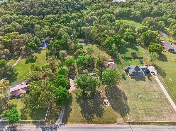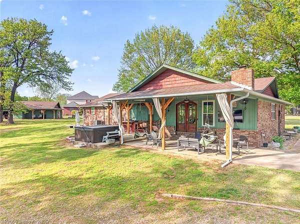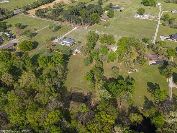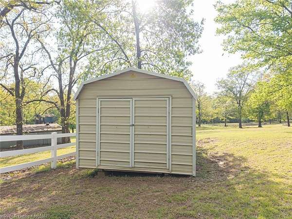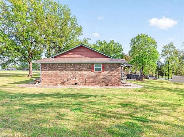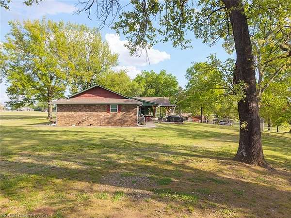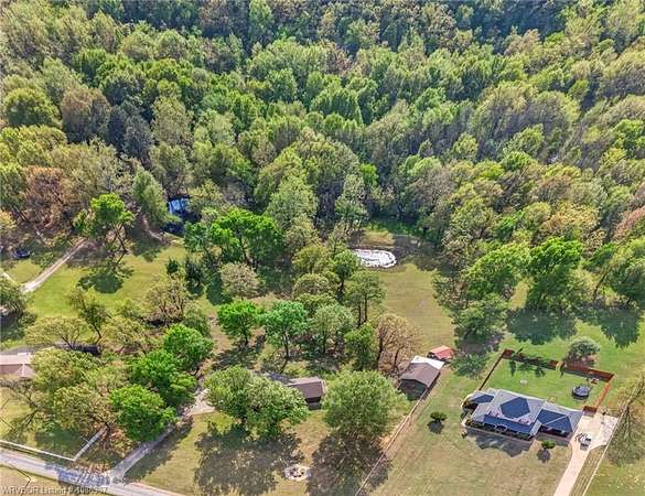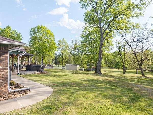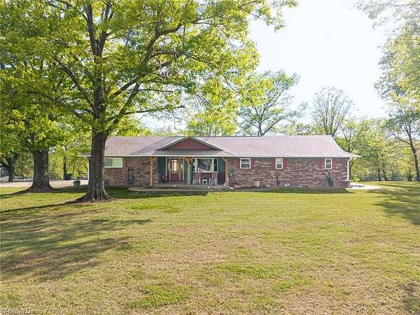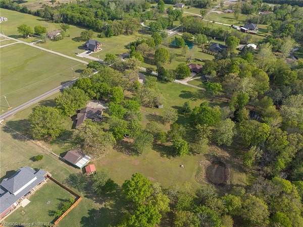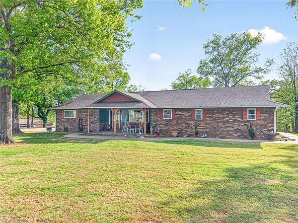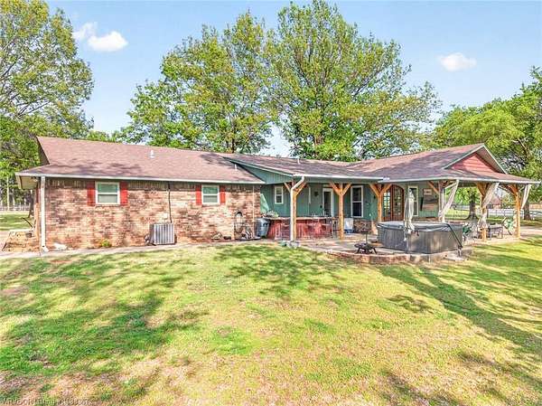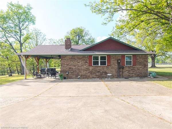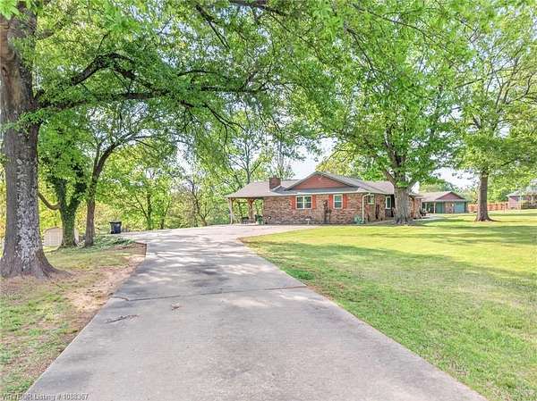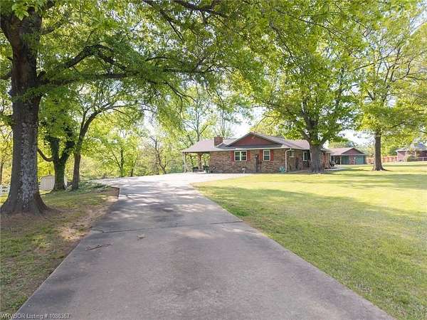 Remodeled home on 3.54 acres offering the perfect blend of modern updates and peaceful country living, just approximately 8.9 miles from the Fort Smith, Arkansas state line. This all-electric home features an open-concept layout with wide plank flooring, abundant natural light, and a cozy wood-burning fireplace anchoring the spacious living area. The kitchen is a true showstopper with a massive quartz island, farmhouse apron-front sink, custom shaker-style cabinetry, stainless appliances, built-in oven, and extensive storage-perfect for both everyday living and entertaining. Beadboard ceilings with recessed lighting add warmth and character throughout. The oversized primary suite offers a private retreat with sliding barn-style doors leading to a spa-like ensuite featuring a freestanding soaking tub, dual vessel sinks, and a beautifully tiled walk-in shower with glass enclosure. Additional bedrooms are generously sized with updated finishes. Step outside to enjoy the covered back patio overlooking a park-like setting with mature trees and a small pond, creating a peaceful outdoor space. The property also includes a detached shop with a one-car garage, electric, and a finished bonus room ideal for a hobby room or office, plus a lean-to for additional storage. Move-in ready, 3 Bedrooms & 3 Bathrooms with quality updates throughout-this home offers space, style, and convenience all in one!