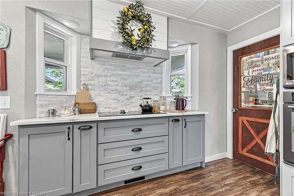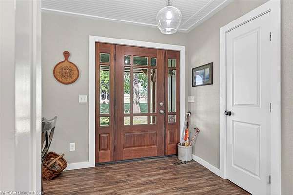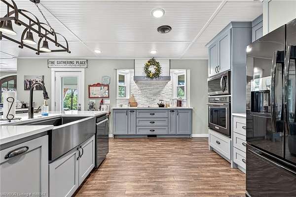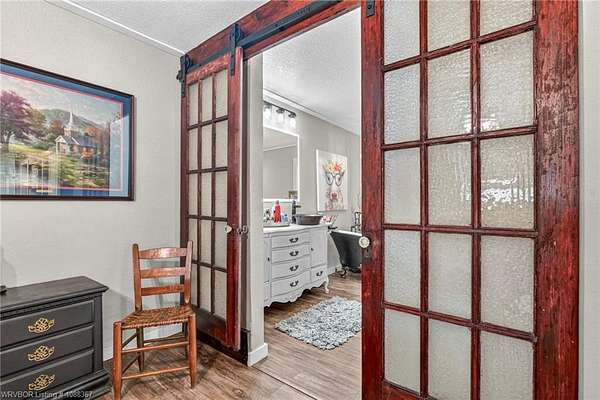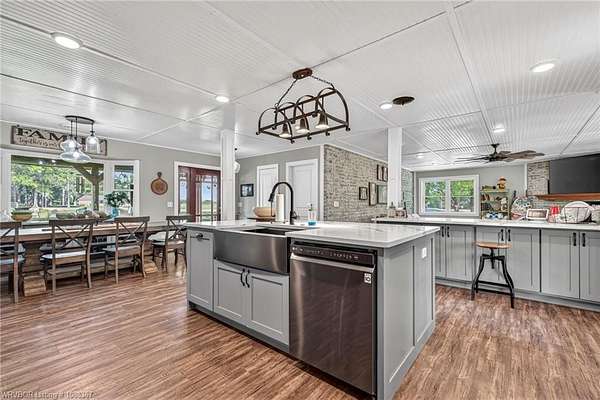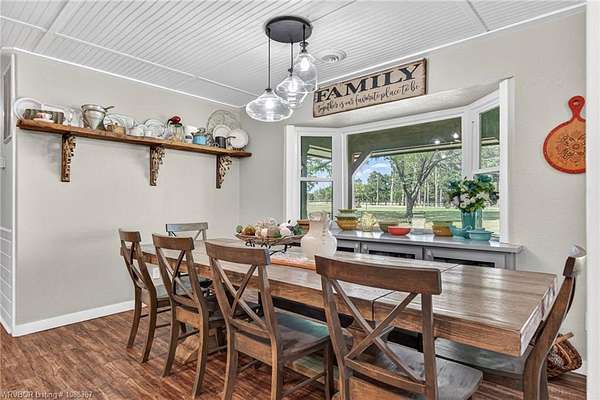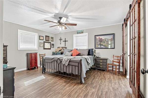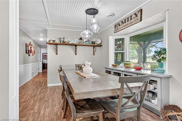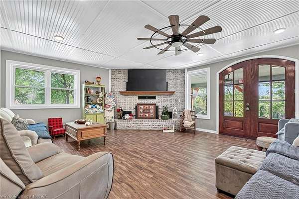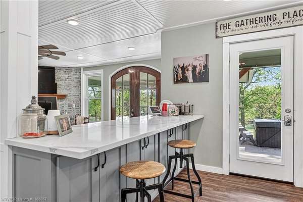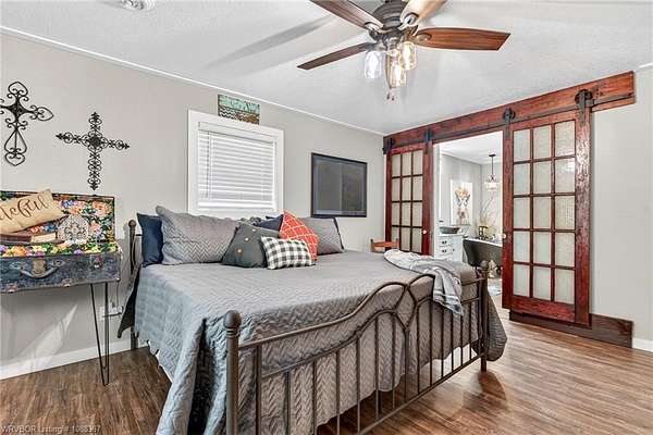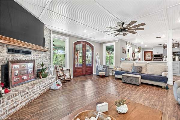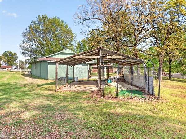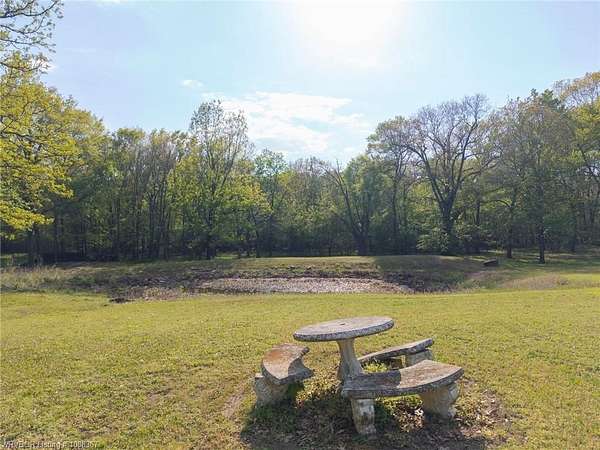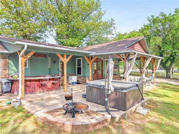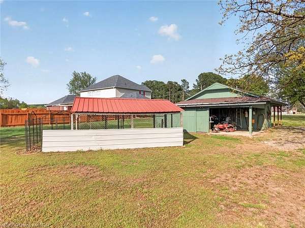 Remodeled home on 3.54 acres offering the perfect blend of modern updates and peaceful country living, just approximately 8.9 miles from the Fort Smith, Arkansas state line. This all-electric home features an open-concept layout with wide plank flooring, abundant natural light, and a cozy wood-burning fireplace anchoring the spacious living area. The kitchen is a true showstopper with a massive quartz island, farmhouse apron-front sink, custom shaker-style cabinetry, stainless appliances, built-in oven, and extensive storage-perfect for both everyday living and entertaining. Beadboard ceilings with recessed lighting add warmth and character throughout. The oversized primary suite offers a private retreat with sliding barn-style doors leading to a spa-like ensuite featuring a freestanding soaking tub, dual vessel sinks, and a beautifully tiled walk-in shower with glass enclosure. Additional bedrooms are generously sized with updated finishes. Step outside to enjoy the covered back patio overlooking a park-like setting with mature trees and a small pond, creating a peaceful outdoor space. The property also includes a detached shop with a one-car garage, electric, and a finished bonus room ideal for a hobby room or office, plus a lean-to for additional storage. Move-in ready, 3 Bedrooms & 3 Bathrooms with quality updates throughout-this home offers space, style, and convenience all in one!