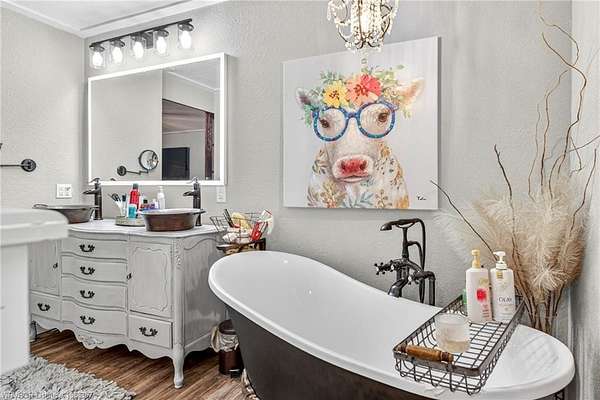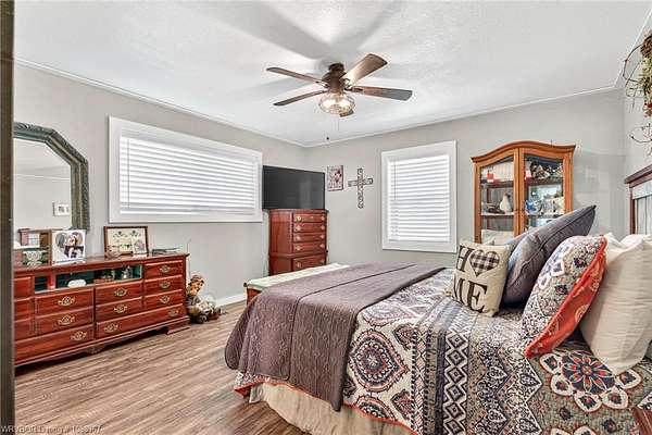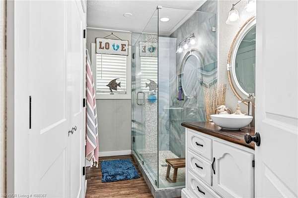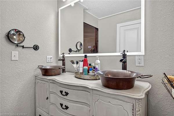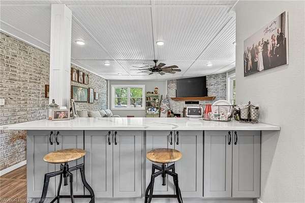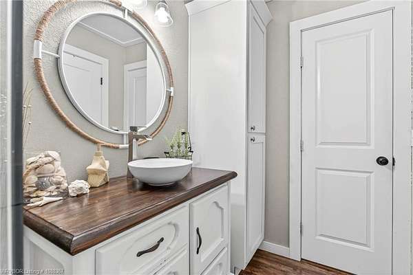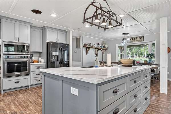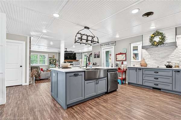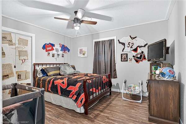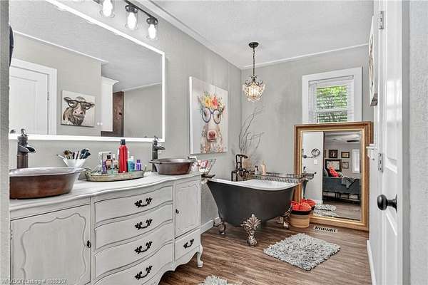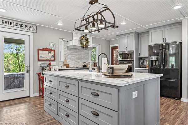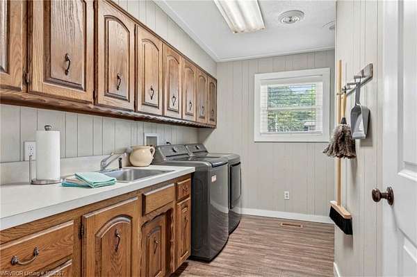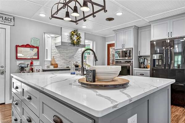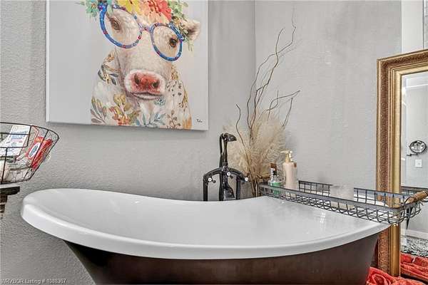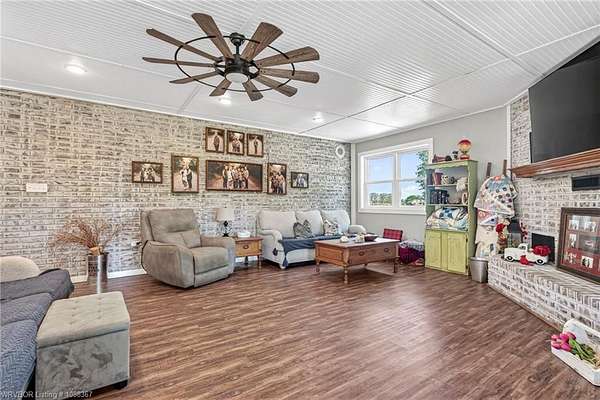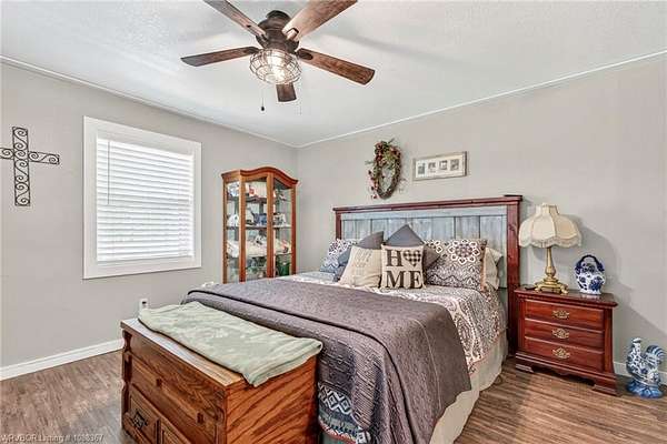 Remodeled home on 3.54 acres offering the perfect blend of modern updates and peaceful country living, just approximately 8.9 miles from the Fort Smith, Arkansas state line. This all-electric home features an open-concept layout with wide plank flooring, abundant natural light, and a cozy wood-burning fireplace anchoring the spacious living area. The kitchen is a true showstopper with a massive quartz island, farmhouse apron-front sink, custom shaker-style cabinetry, stainless appliances, built-in oven, and extensive storage-perfect for both everyday living and entertaining. Beadboard ceilings with recessed lighting add warmth and character throughout. The oversized primary suite offers a private retreat with sliding barn-style doors leading to a spa-like ensuite featuring a freestanding soaking tub, dual vessel sinks, and a beautifully tiled walk-in shower with glass enclosure. Additional bedrooms are generously sized with updated finishes. Step outside to enjoy the covered back patio overlooking a park-like setting with mature trees and a small pond, creating a peaceful outdoor space. The property also includes a detached shop with a one-car garage, electric, and a finished bonus room ideal for a hobby room or office, plus a lean-to for additional storage. Move-in ready, 3 Bedrooms & 3 Bathrooms with quality updates throughout-this home offers space, style, and convenience all in one!