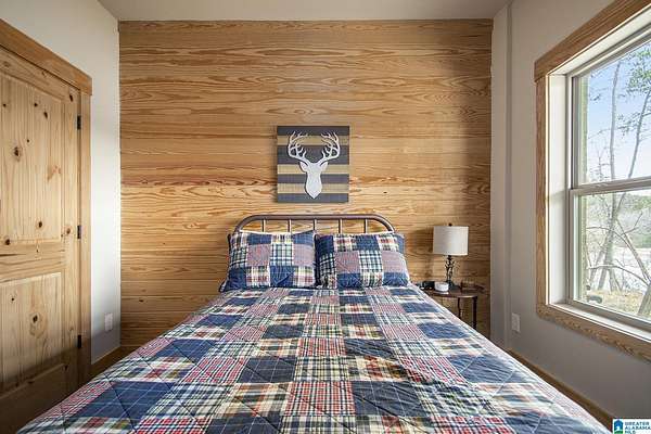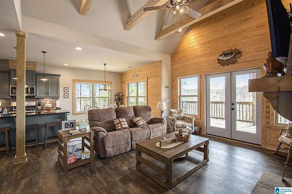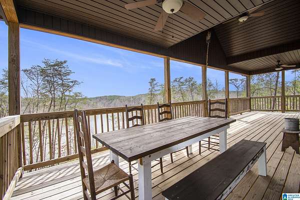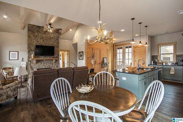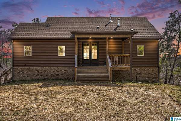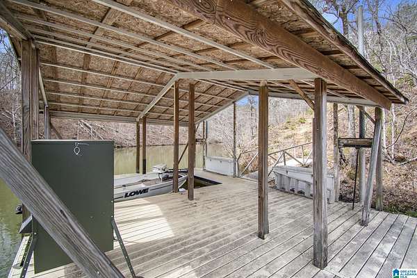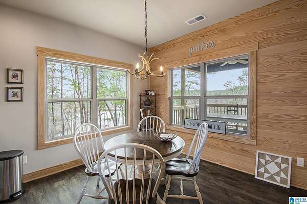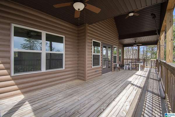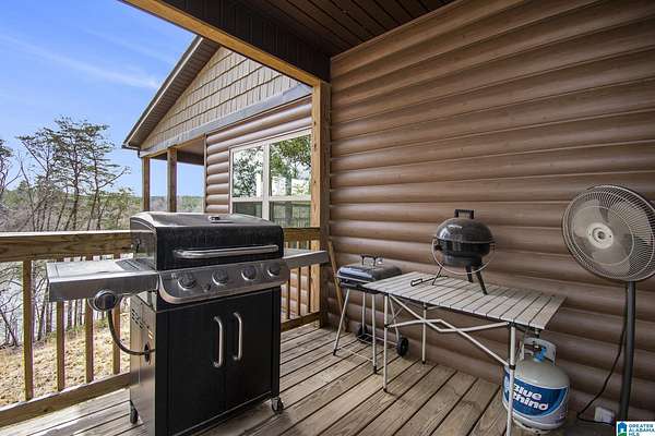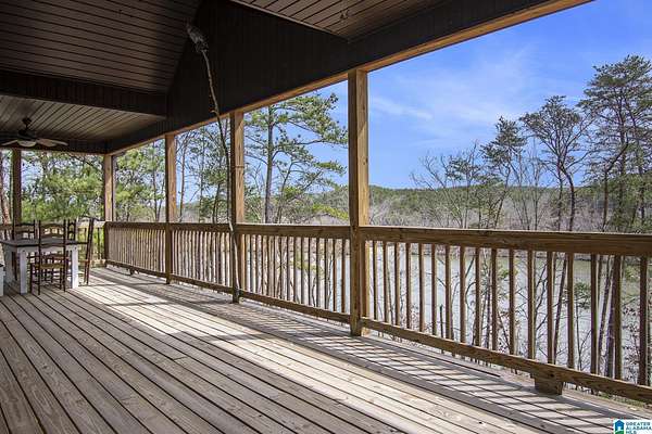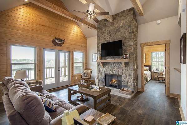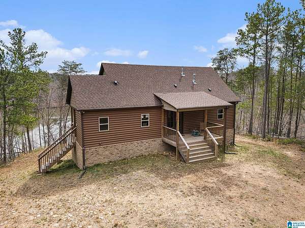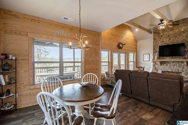 Nestled on 21.65 wooded acres in Pine Valley, a gated community, this charming rustic cabin offers the perfect blend of seclusion and modern comfort. Featuring hardwood floors throughout, tongue and groove accent walls, gorgeous kitchen with solid surface countertops and ample storage, oversized island, eat in area, and stunning floor to ceiling stone woodburning fireplace in the living room. Open floorplan with an abundance of windows to take in all the views. Primary bedroom on the main level with a luxurious shower & double vanity. Half bath and large laundry room on the main level as well. 2 additional large bedrooms, den/game room and full bath on the basement level. Enjoy break taking views from covered porches on both levels. Outdoor enthusiasts will love the private boat dock, excellent hunting, and fishing opportunities right at their doorstep. No maintenance vinyl siding that looks like a log home! Comes with Whole house generator! Rustic charm and style with privacy.