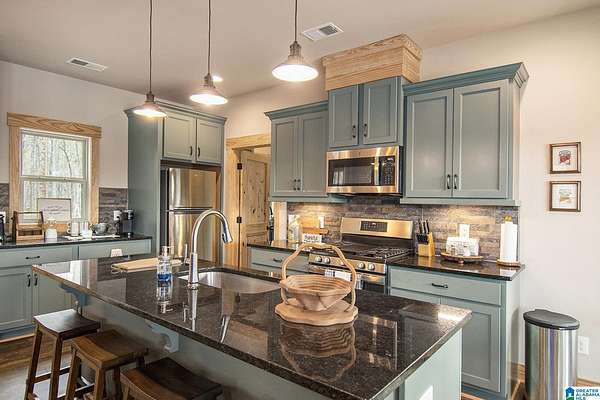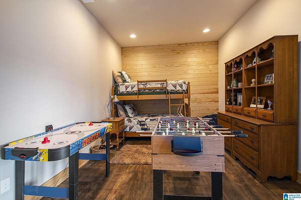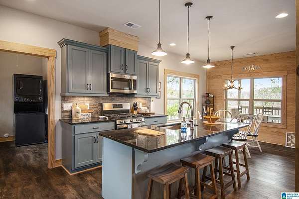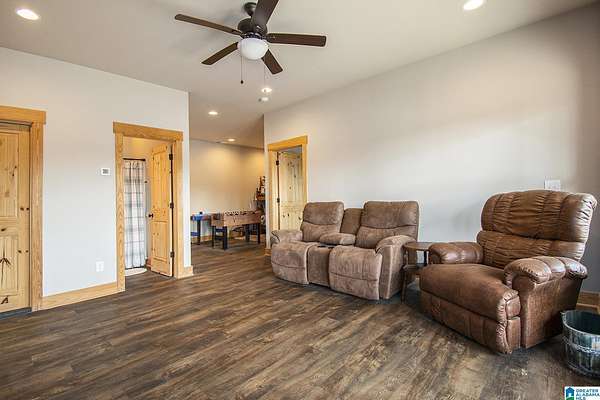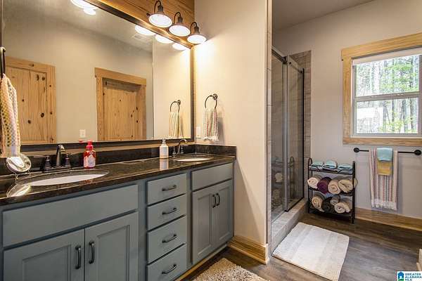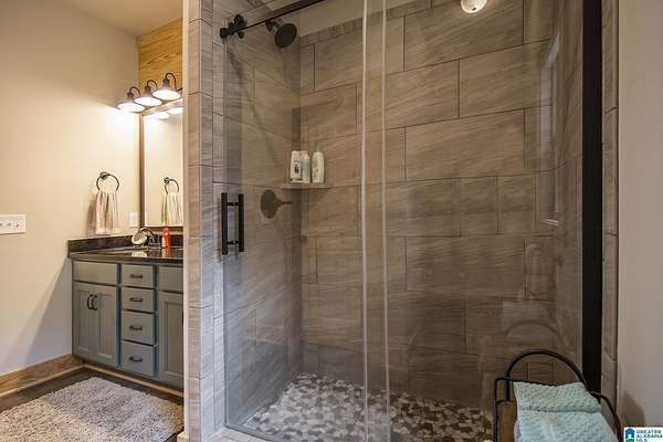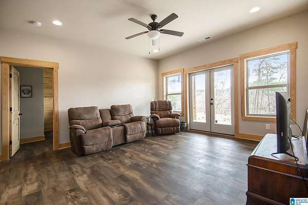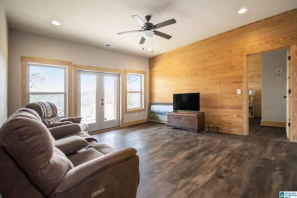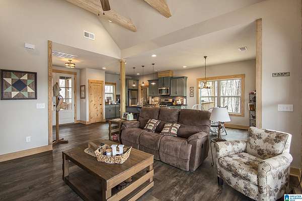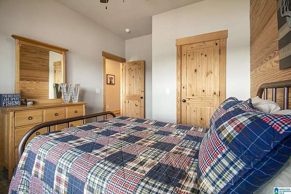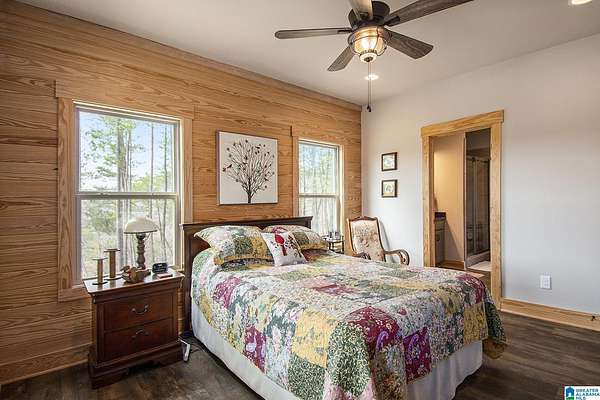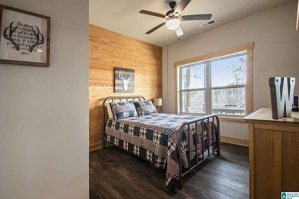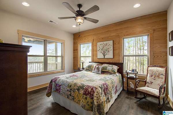 Nestled on 21.65 wooded acres in Pine Valley, a gated community, this charming rustic cabin offers the perfect blend of seclusion and modern comfort. Featuring hardwood floors throughout, tongue and groove accent walls, gorgeous kitchen with solid surface countertops and ample storage, oversized island, eat in area, and stunning floor to ceiling stone woodburning fireplace in the living room. Open floorplan with an abundance of windows to take in all the views. Primary bedroom on the main level with a luxurious shower & double vanity. Half bath and large laundry room on the main level as well. 2 additional large bedrooms, den/game room and full bath on the basement level. Enjoy break taking views from covered porches on both levels. Outdoor enthusiasts will love the private boat dock, excellent hunting, and fishing opportunities right at their doorstep. No maintenance vinyl siding that looks like a log home! Comes with Whole house generator! Rustic charm and style with privacy.