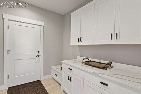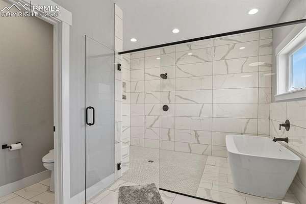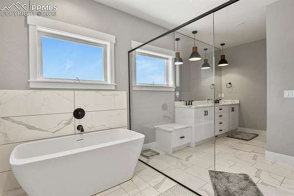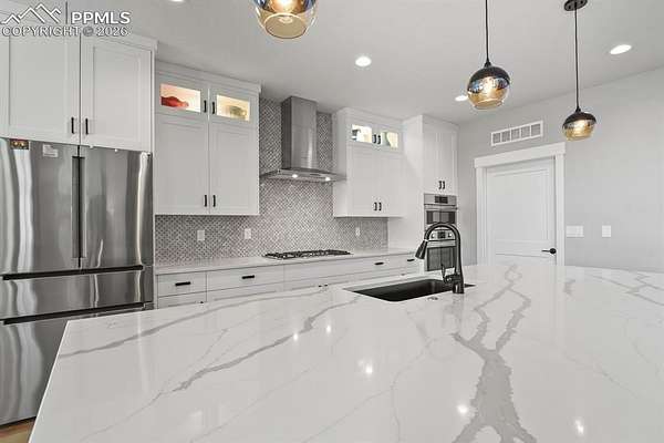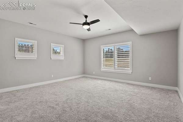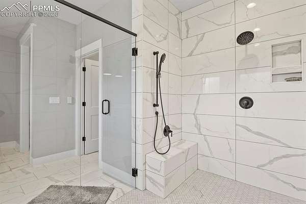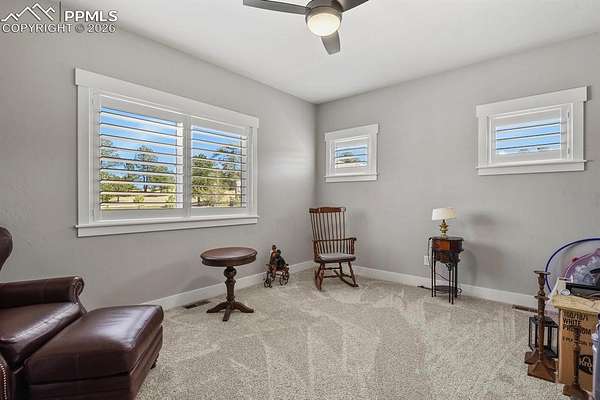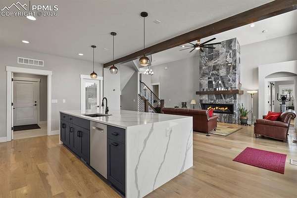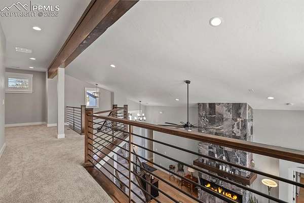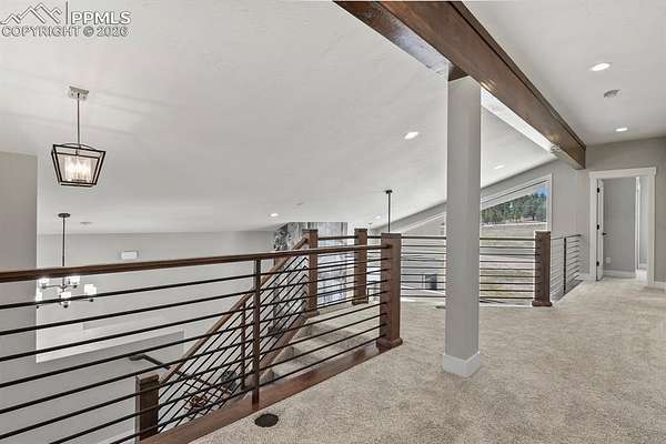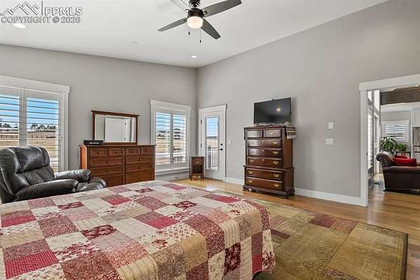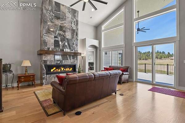 This Black Forest gem provides luxurious living in a peaceful rural setting while remaining very convenient to all of your local amenities. Nestled on 3.5 acres, this 6-bedroom, 5-full bath home is perfect for those ready for plenty of room for everyone to relax, work, and play. The open layout is highlighted by white oak hardwood floors, soaring ceilings, rich wood beams, hand textured walls, 5" base, solid wood doors, and a wall of windows flooding the space with natural light. The gourmet chef's kitchen features Bosch stainless appliances, a waterfall-edged quartz island, soft-close cabinetry, lighted glass cabinets, tile backsplash, crown molding, and a walk-in pantry that will not disappoint. The Great Room is anchored by a gorgeous linear fireplace, wood mantle, floor-to-ceiling tile, 23' ceilings, and an oversized covered composite deck just outsside, perfect for entertaining. The main floor Master Retreat includes a 5-piece en-suite bath with an enclosed spa-like wet area-soaking tub, shower bench, multiple shower heads, a large walk-in closet, and private access to the covered deck. The main floor also includes an additional bedroom and full bath that makes for a perfect guest room or a home office suite. Upstairs you will find two more bedrooms, a loft perfect for a play room or game room, and a full bath with a double vanity. The Walk-Out basement includes a huge recreation room, a second kitchen, a TV/gaming area, a bedroom with en-suite bath, a second bedroom and full bath, a dedicated mechanical room and a separate storage room/safe room/storm room. Walk out to the recently expanded 1,900 square foot patio, perfect for entertaining and plenty of room for the kids to play. The newly expanded paved driveway leads to the fully insulated and drywalled 4-car tandem garage and RV bay. Barely lived in and nearly new, this beautiful home is perfectly located for quiet rural living and is still convenient to all of the local amenities. Welcome home.