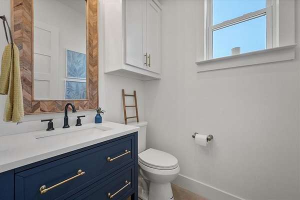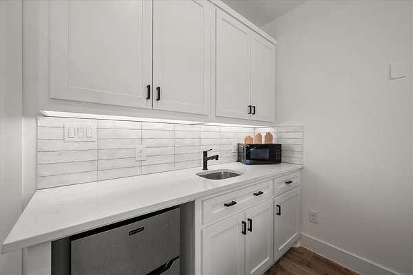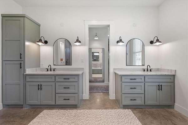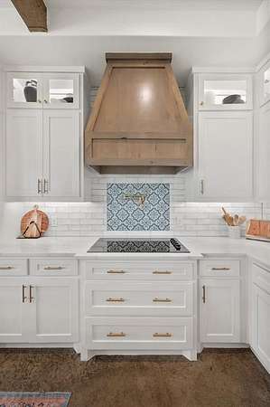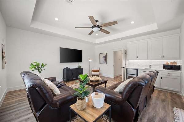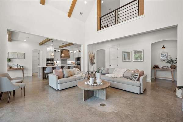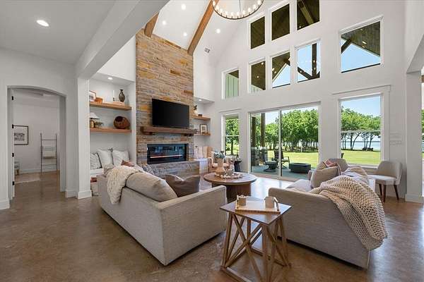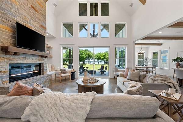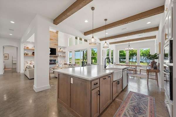 The main home features lake views from every room, tall ceilings, 8-ft doors, and an exquisite design focused on living life on "lake time." The open kitchen, dining, and living area bring family and guests together with ease. The kitchen is beautifully appointed with tall custom cabinetry, quartz counters, stylish tile accents, and an oversized island perfect for entertaining and family gatherings.