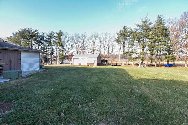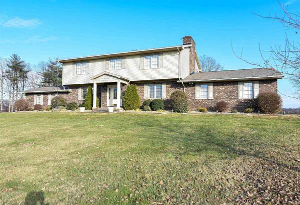 Rare Find! If you've been wishing for a 4 bedroom 2.5 bath home, finished basement, pole barn and a little personality, this one-owner 2-story sits on 3 gorgeous, peaceful acres in a desirable Haubstadt location. With space to breathe, privacy and room to grow. The front entry features tile and a warm welcome and just off is the inviting family room with wood beams, built in cabinets, shelves and electric fireplace. Off the family room is a handy 1/2 bath and laundry room with access to the back deck. To the left is the big classic living room that flows into the dining room with lots of built in wood cabinets. The kitchen has everything you need, from quality wood cabinets to a range hood, oven, microwave, and dishwasher. It's the kind of kitchen that's made for cooking, chatting, snacking, and laughing all at once. Upstairs you'll instantly appreciate the oversized closets, 4 bedrooms and huge hall closet. The full hall bath features a double vanity and tub/shower linen, walk in closet and 2 laundry shoots. The primary suite is a quiet retreat all on its own. It has a brick fireplace, a private full bath, a sitting area, a big walk-in closet and a private upper deck strong enough for a hot tub. The finished basement gives you even more to love: a family room with a wet bar, a huge storage room and another finished room ready for hobbies, workouts, or play room. A concrete ramp leads to the workshop, complete with its own half bath. Add in the attached oversized 2.5-car insulated garage with an 18' door, the 30x36 pole barn with lean to, two 9' doors, upstairs loft, and you've got storage for days. Between the space, the barn, the storage, and the gorgeous land...homes like this simply don't hit the market often.