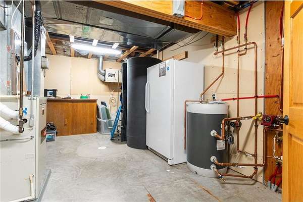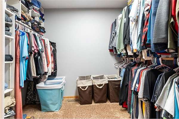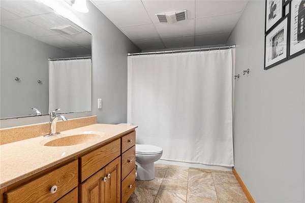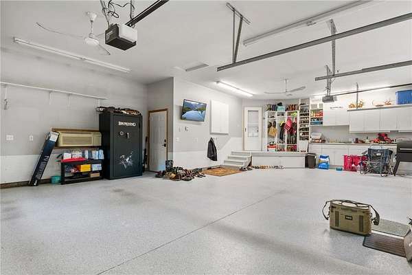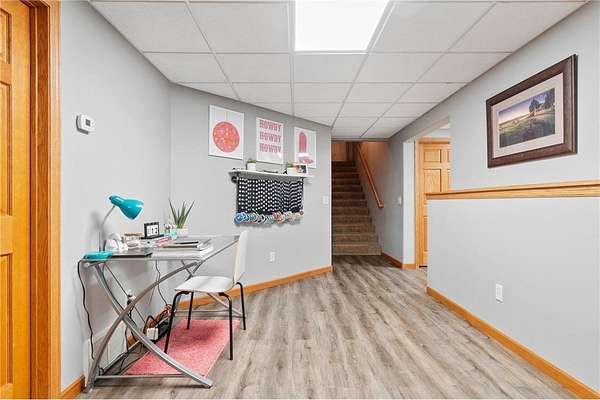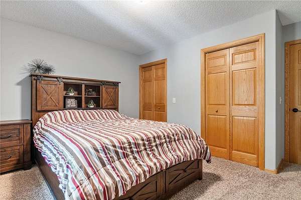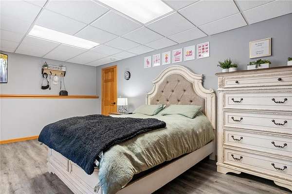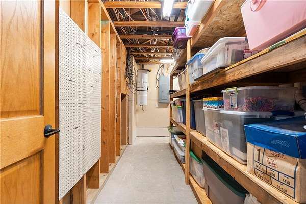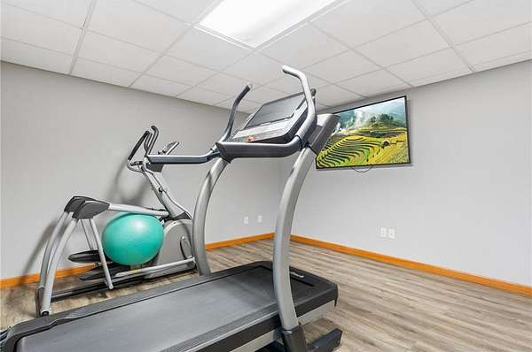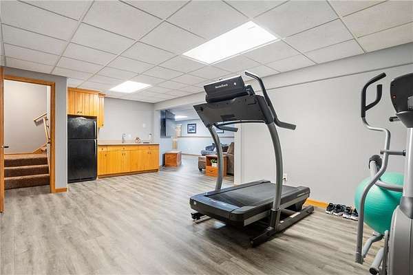 The lower level offers additional space with a family room, fitness area, two more bedrooms, and plenty of storage.