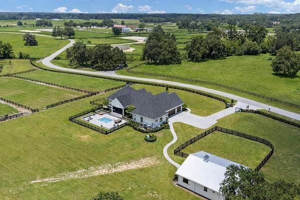 PRIVATE/OWNER FINANCING Options available for qualified purchasers. Just minutes from the World Equestrian Center and Golden Ocala Golf & Equestrian Club, this extraordinary 2023-built estate presents a rare convergence of modern architectural elegance and world-class equestrian functionality, all set across nearly 11 impeccably manicured acres behind private gates. Designed for the discerning equestrian, the property features a professional 105' x 150' riding arena with premium clay footing, four spacious barn stalls, an air-conditioned tack room, and dual wash racks, all thoughtfully positioned for efficiency, comfort, and horse welfare. Fully fenced and irrigated pastures and paddocks with water throughout provide an ideal environment for training, turnout, and long-term care, while two gated entrances ensure privacy, security, and seamless access for trailers and service vehicles.