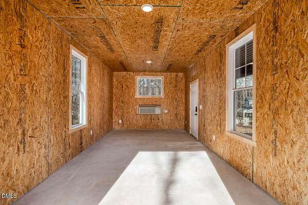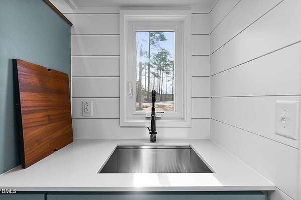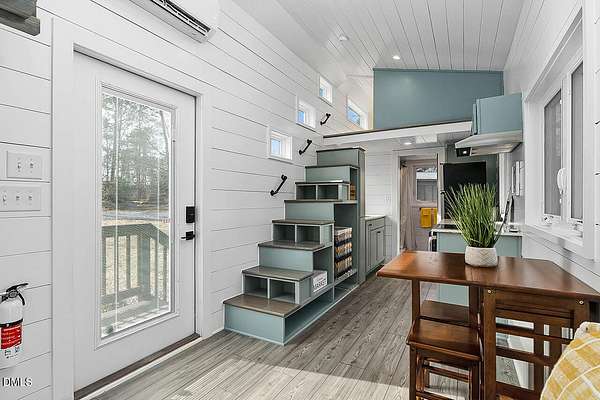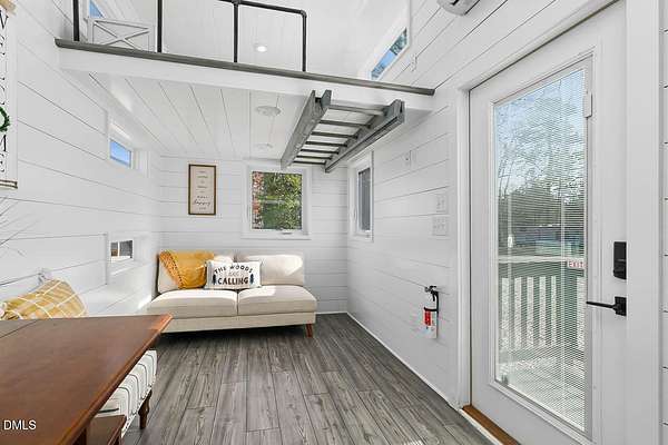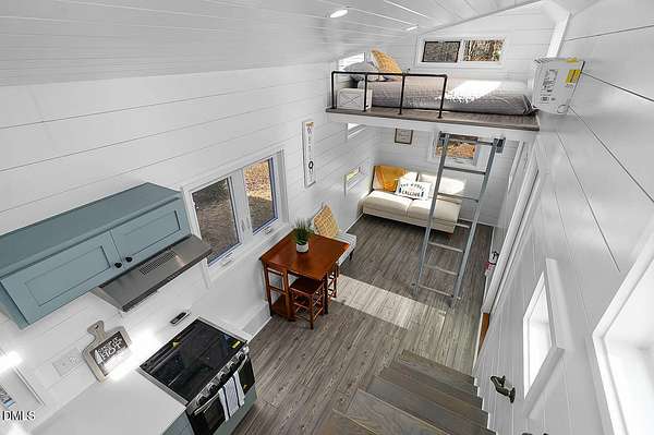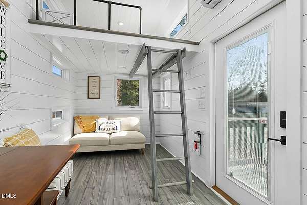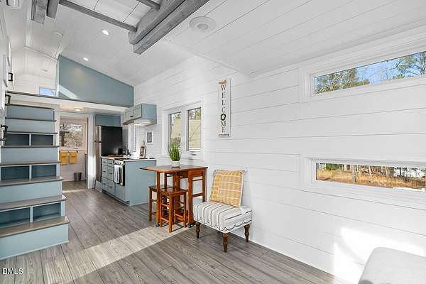 Double lot in Lake Royale's gated lake community, offering a low-maintenance tiny home suitable for full-time living, weekend use, or an affordable second home near the water. Approx. 349 sq ft total, with 224 sq ft on the main level and 125 sq ft of combined loft space. Interior includes shiplap walls, tongue and groove ceiling, and luxury vinyl plank flooring. Kitchen features quartz countertops, custom cabinetry, stainless workstation sink, full-size appliances, electric range with vent hood, pantry cubbies, and washer/dryer hookup. Bathroom offers residential shower, quartz vanity, and custom cabinetry. Primary loft includes built-in closet. Mini-split system for efficient heating and cooling. Built on a ''Trailer Made'' trailer with 50-amp service, 17 windows, cedar siding, cedar shake accents, and metal roof. Property includes a 12x24 climate-controlled shed, 8x24 covered storage, two driveways, and septic system. Turnkey with lot available or Tiny Home alone available for $110,000. Community amenities include boating, fishing, swimming, pool, clubhouse, and recreation areas.