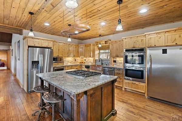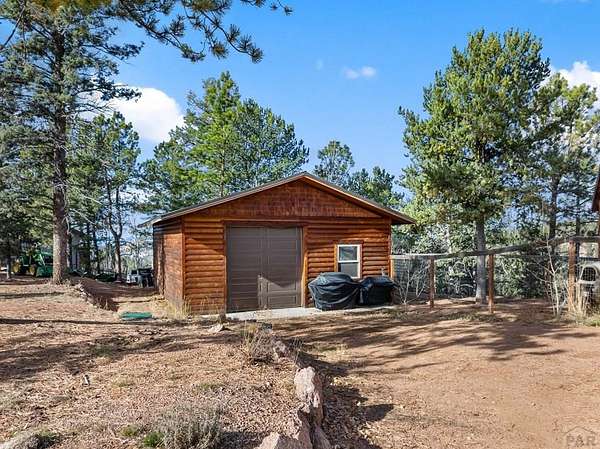 Charming Custom Built Log Home with Sweeping Mountain Views Discover the beauty of Colorado living in this handcrafted 2- bedroom, 2-bath log home, nestled on 3.75 acres of pristine land with breathtaking 360 vistas, including Sentinel Point at Iconic Pikes Peak. This retreat blends rustic charm with modern comfort, featuring; engineered hardwood floors, leathered granite countertops, beautifully crafted custom-built cabinetry, double ovens, with additional wine cooler and separate freezer built into the cabinetry. The Dacor 6 burner gas range adorns the 6' by 52" Island and makes the kitchen a Chef's dream perfect for entertaining or just cooking that gourmet meal. The open concept Kitchen, Dining and Great Room, filled with natural light and the floor to ceiling stone fireplace showcases the warmth of authentic log construction. Step outside to enjoy the expansive deck and explore your private acreage, embraced by nature and overlooking unobstructed majestic mountain landscapes including views of the Collegiate and Sangre de Cristo ranges. The oversized 24x24 attached double car garage and a 30x24 detached, insulated, log-sided workshop offers versatile space for hobbies, storage, or creative pursuits. Whether you're seeking a full-time residence, a vacation escape, or a peaceful retreat, this one-of-a-kind property offers craftsmanship, comfort, and a deep connection to the land.
