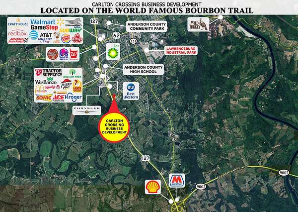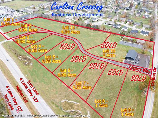 Welcome to Lawrenceburg's newest business development; Carlton Crossing! This 4.14+- acre lot is located on the World Famous Bourbon Trail & talk about LOCATION, LOCATION, LOCATION! This lot is ideal for a micro-brewery, micro-distillery, hotel complex, assisted community campus, & more! Preliminary plat offered 11 total lots, 6 have sold, & 5 currently remain so DO NOT WAIT! BRAND NEW BEAUTIFUL FIVE STAR STATION JUST BUILT! Ideal for restaurants, retail, hotels, medical, bourbon industry,& more. Ready to go turn lanes, median cut, & fully developed w/natural gas, electric city water/sewer, & streets. Located in the city limits & offers exceptional exposure, high rooftop counts, & stunning traffic counts! Sits directly on TWO state highways;4 lane US Bypass South/North HWY 127 & 2 lane state HWY Carlton Drive, plus interior roadway Legacy Way. Close to many high traffic businesses including but not limited to; Kroger, McDonalds, Tractor Supply, restaurant franchises, schools, & much more! Please note ;Plat is preliminary & lot lines are approximate & can be adjusted/removed if desired. Broker relative to seller. Call today to schedule your showing!