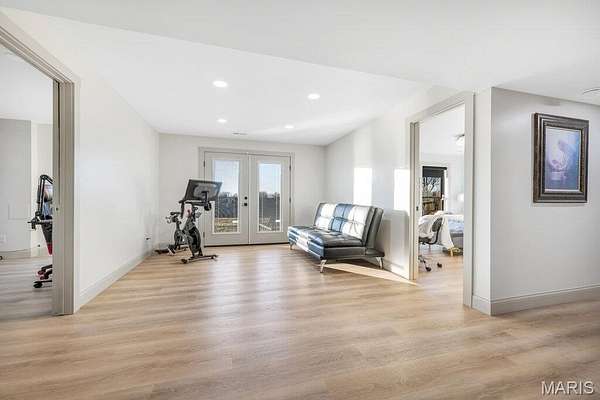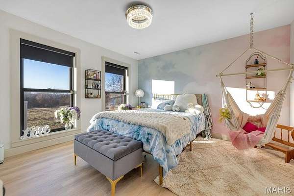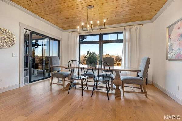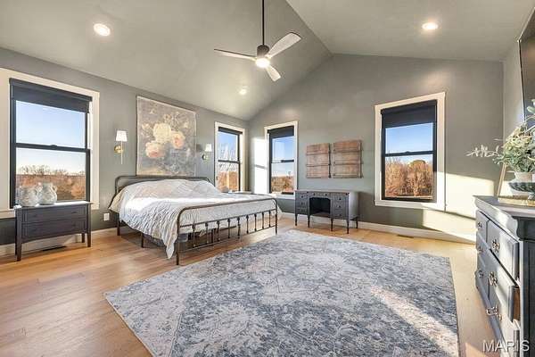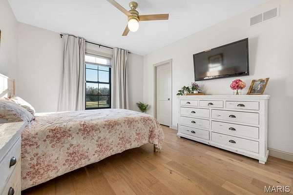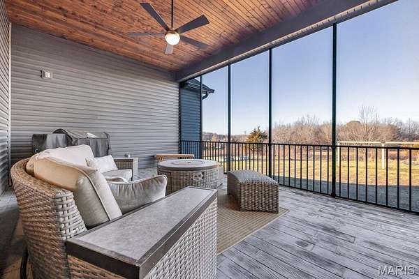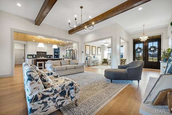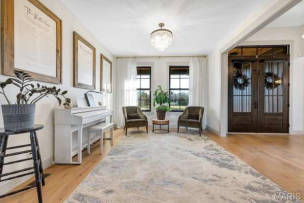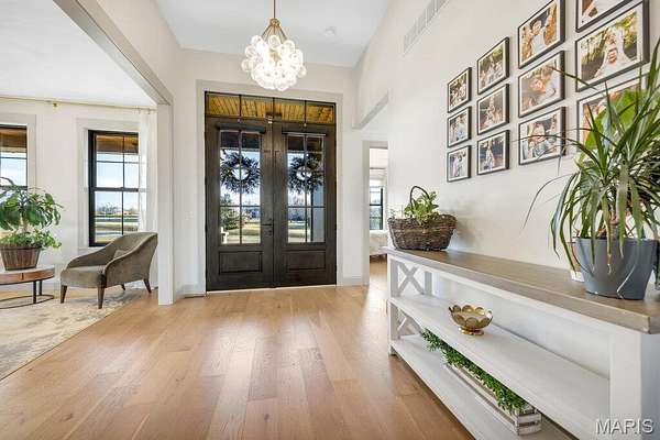 *OPEN HOUSE Sunday January 18th from 11am-1pm*. Welcome to 111 Kentucky Derby that is nestled within the prestigious & horse-friendly community of Indian Creek Farms, this home stands as a masterclass in modern farmhouse design & thoughtful luxury. Situated on a 3 acre corner lot within the highly-regarded Wentzville School District, this home offers the perfect blend of serene country living with sophisticated, high-end finishes. From the moment you pull up to the oversized 3 car side-entry garage, it is clear that every detail of this property has been curated for comfort, style & functionality. The journey begins at the south-facing 275sqft covered front porch, featuring a dark-stained tongue-and-groove wooden ceiling that sets a warm, inviting tone. Through the dark wood double doors with classic glass panels, you are greeted by an airy entryway that flows seamlessly into the heart of the home. The Living Room serves as a stunning focal point, anchored by a white stone ventless gas fireplace & soaring 11-foot ceilings adorned with wooden beam accents. Large picture windows flood the space with natural light, highlighting the light hardwood floors that run throughout the main level. Adjacent to the living room is the Formal Dining Room, currently utilized as a music & sitting room. The kitchen is a triumph of design and utility. It features a massive 5x8 center island with rich dark wood cabinetry, contrasting beautifully with the classic custom white cabinetry along the perimeter. Features include: