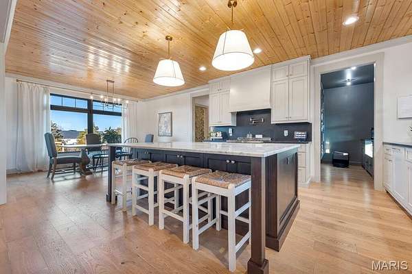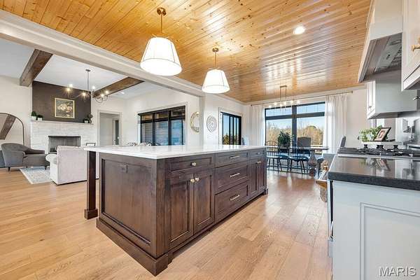 - Designer Lighting: Soft pendant lighting over the island and recessed lighting across the natural wood plank ceiling.