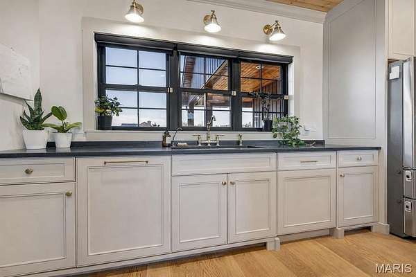 - Stainless Steel Range: A professional-grade gas range with a custom hood and convenient pot filler faucet.
