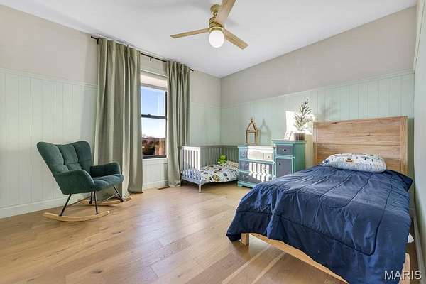 The Primary Suite is a moody, sophisticated retreat featuring vaulted ceilings and a lighted fan. The en-suite bathroom is a showstopper, boasting an emerald green tiled walk-in shower with gold hardware and a zero-entry design. The double vanity features custom cabinetry, leading to spacious his-and-her walk-in closets.