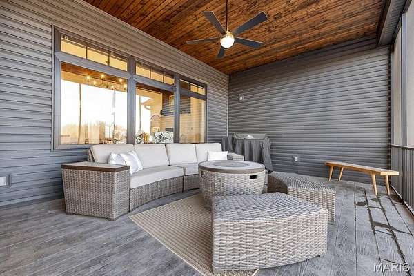 The exterior of the home is designed for those who love the outdoors. The 14x20 screened-in back porch features a stamped concrete floor, dark wood stained tongue & groove ceiling & a lighted ceiling fan. The side walk-out basement leads to a large concrete patio. The grounds are even prepared for the future, with young fruit & citrus trees that will soon be producing. For ultimate relaxation, a custom outdoor station with a natural wood frame and black metal brackets provides a front-row seat to the beautiful Missouri sunsets.