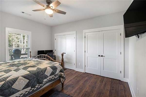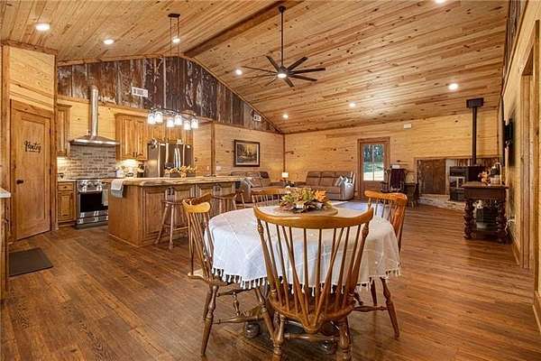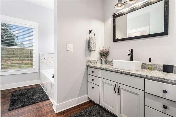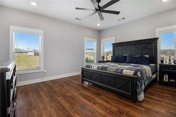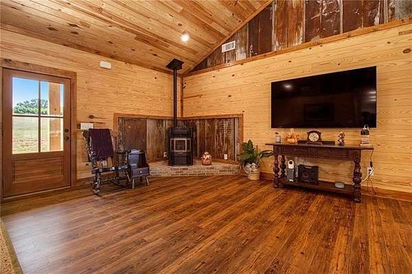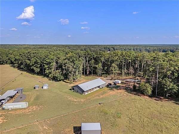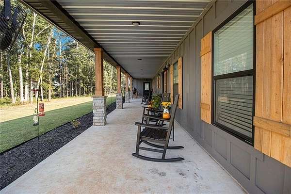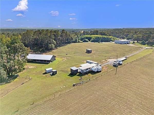 Welcome to your peaceful retreat nestled on 10 fully fenced acres with cross fencing. This beautiful ranch home offers luxury amenities with rustic charm just 45 minutes from Atlanta, and 25 minutes to Macon. As you step in the front door you will notice the new luxury vinyl plank flooring, and the huge kitchen island with ample storage. The new flooring contrasts nicely against the reclaimed metal used in the upper wall space. A split bedroom floor plan ensures maximum privacy for the entire family. The open concept living room and kitchen is ideal for family gatherings and meal preparation. There are quartz counters in the kitchen, and a walk-in pantry. Enjoy warmth in the family room with the Pellet Stove with a thermostat and blower. Never worry about power outages with the Generac Whole Home Generator with 26kW that can keep the entire home powered! The HVAC system includes a UV filter to kill mold, bacteria and viruses in the system. The primary suit offers an oversized tub, walk in shower and plenty of closet space. The separate laundry room has additional cabinetry and folding space. The garage is enormous and with 12' garage doors. You will find power for EV charging, a tankless water heater and a storm shelter with a half bath. The covered front and back porches offer additional space to unwind, grill out, or simply take in the views. Outside you will find 2 covered RV hookups with dedicated septic and water. There is a fully equipped bathhouse with washer and dryer connections, and a second driveway to access the RV area. There is a run-in shed in the larger pasture, and a smaller pasture that housed goats. The exterior of the home offers dawn to dusk lighting and additional exterior storage. Work from home with high speed fiber internet. Come and see all this home has to offer!