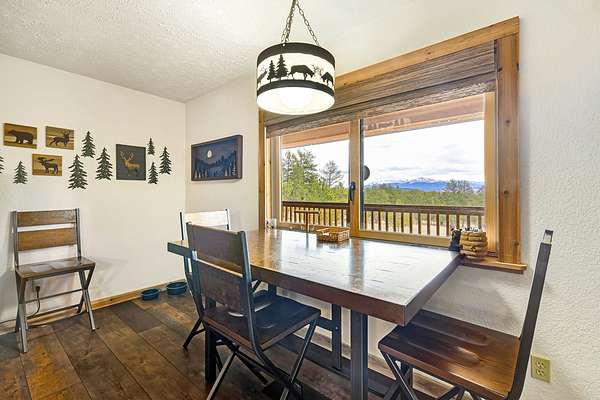 The open-concept main living area flows into the kitchen with Corian countertops, breakfast bar, eat-in space, and updated appliances. High ceilings and double-pane windows allow natural light to fill the space while framing spectacular mountain views.