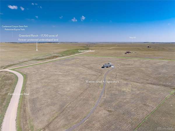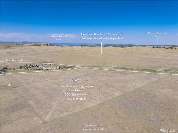 PRICE REDUCTION! Welcome home to East Larkspur! This fully remodeled home with a full finished basement is a RARE find! Peace and privacy awaits on 35-acres zoned for A-1 agriculture zoning and with prairie-to-peak panoramic views! Conveniently located just east of I-25 on Greenland Road where your only neighbors to the north are the cattle that graze the nearly 18,000 acres of conservation easement protected land known as Greenland Ranch. With Pikes Peak's majestic presence to the south and Rattlesnake Butte to the west, where the sunsets are a sight to behold, you'll feel like you've escaped the busy life "out there." Here, it's quiet, expansive, and breathtaking — and all yours to create the life you've always wanted. Live out your dream of becoming a rancher or hobby farmer, or simply enjoy the low-maintenance lifestyle this move-in ready, fully renovated, ranch-style home can offer! Inside you'll immediately notice all the sunlight this home allows in and how functionally and thoughtfully remodeled this home is. You'll feel like you've walked into a new home with new luxury vinyl plank floors, carpeting, gorgeous kitchen quartz countertops, appliances, washer and dryer, lighting, hardware, baseboards, interior and exterior paint, new furnace and hot water heater, and a new Class-4 impact-resistant roof! No surface was left untouched in this home! You'll enjoy the vaulted ceilings, skylight, views from every window, and the easy flow here. The primary suite will win you over with its 5-piece bathroom, complete with freestanding soaking tub and huge walk-in closet! The full, finished walkout basement offers a large family room, sunny bedroom with ensuite bathroom, and a large bonus space perfect for an exercise room, a work from home space, or game room! The 2-stall barn with corral is ready for your can't-leave-behind domestic animals! Peaceful living all within minutes to town.