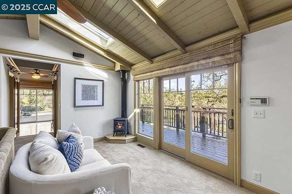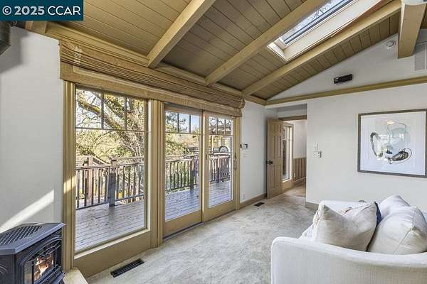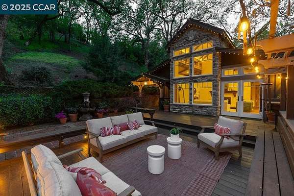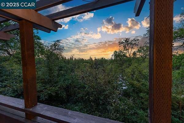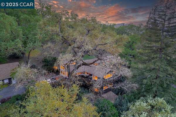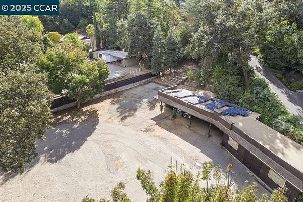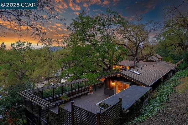 Nestled among majestic oaks, this serene two-story treehouse like home blends charm and functionality with ultimate privacy living above it all with a peek of Mt. Diablo. The gourmet kitchen features a spacious island, gas stove and custom cabinetry. A wood-beamed vaulted ceiling enhances the open living/dining area, where natural light illuminates a grand stone wood and gas fireplace. A mix of hardwood and carpet complete all the living spaces. This structurally sound home has concrete caissons and steel beams. Outside, endless possibilities await. At the house level, there is a two-car garage with built-in cabinets and ample guest parking. Expand your outdoor living space with hundreds of square feet of deck and garden. Just below the house is a rentable studio cottage. At the street level .9 acres of flat lot are ready to be developed as family recreation, vineyard or sustainable farm. Zoned as agriculture provides ultimate flexibility. Current structure, on this lot, protects a 100-year-old barn and supports 38 solar panels. Landscape irrigation supplied by a well adds to the property's sustainability. This peaceful retreat is just minutes from town, top-rated schools, and 680 freeway access. A rare opportunity to own a private oasis with endless potential.