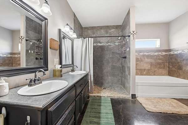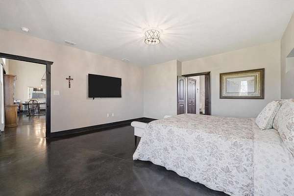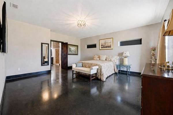 Interior features include polished concrete floors throughout, spray foam insulation in the walls and ceiling, tankless hot water heater, two attic spaces, city water, and aerobic septic. The home also includes a separate mother in law suite with its own private entrance, adding flexibility for guests, extended family, or other needs. One bathroom includes a walk in tub.