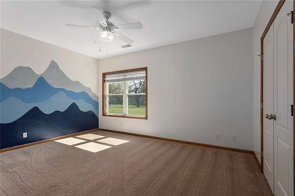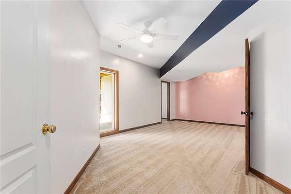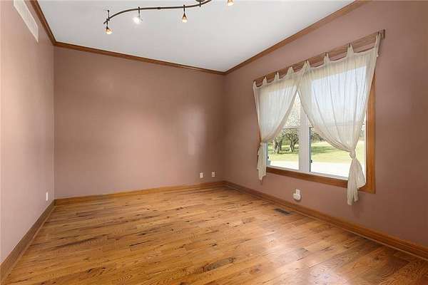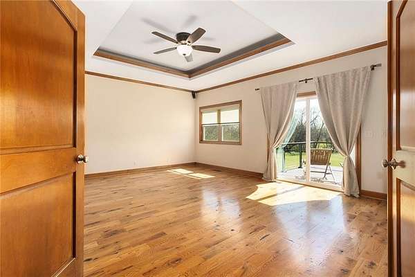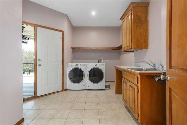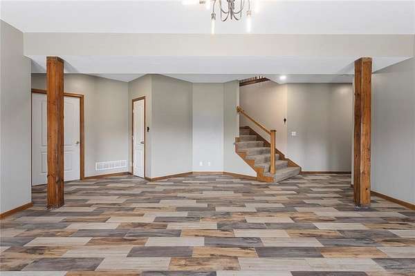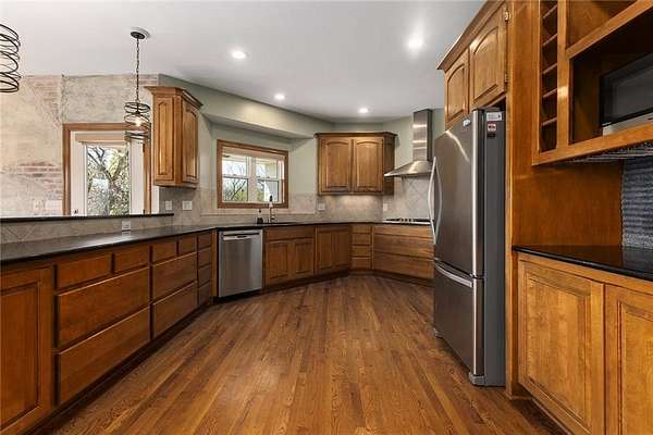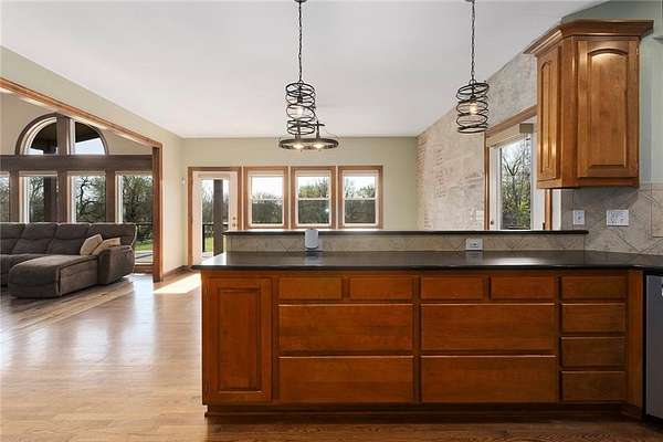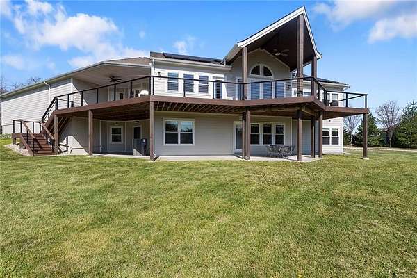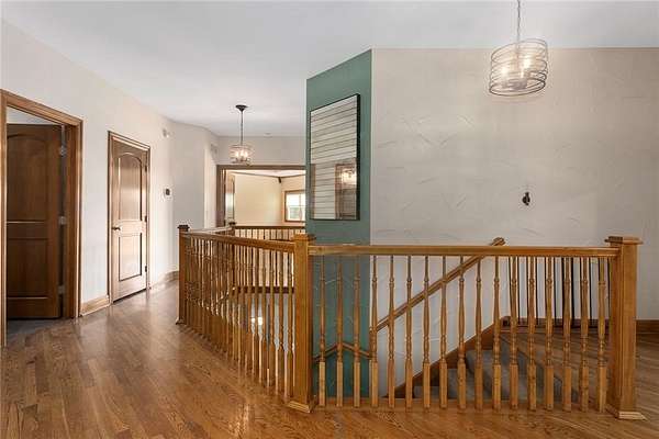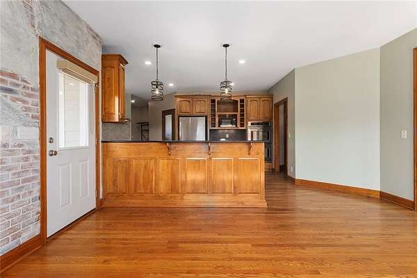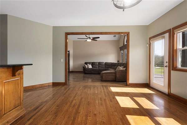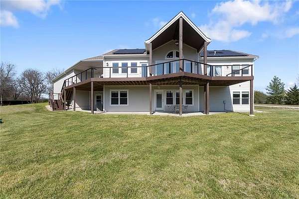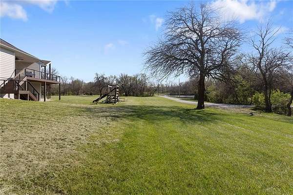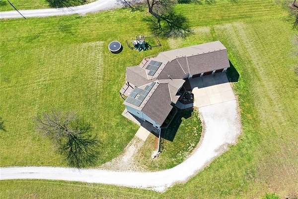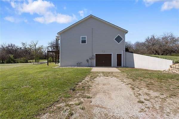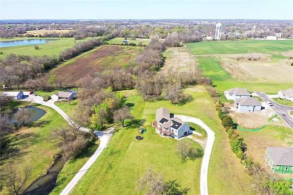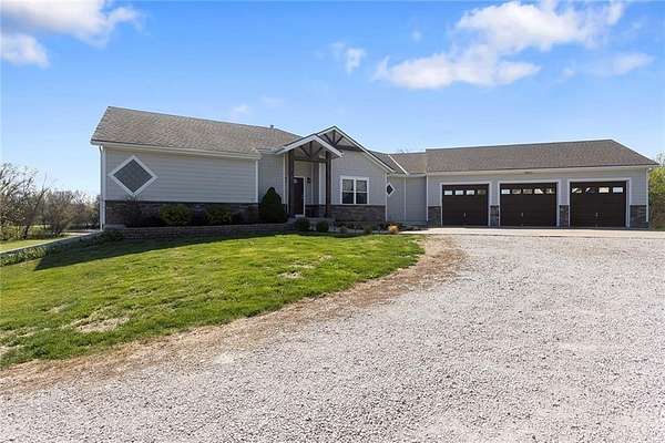 RARE 4-ACRE RETREAT JUST MINUTES FROM KANSAS CITY! Discover the perfect balance of privacy, space, and convenience with this exceptional reverse 1.5-story home tucked away in a picturesque, tree-lined setting. Offering nearly 4 acres of serene landscape, this property delivers a true country-living experience without sacrificing access to top-rated schools, shopping, and city amenities. Designed for both comfort and functionality, this home showcases vaulted ceilings, expansive living spaces, and an abundance of natural light. The main level provides effortless living, while the walkout lower level expands your options with a private 4th bedroom featuring its own exterior entrance-ideal for guests, multi-generational living, or a private office suite. Outdoor living shines with a wraparound deck, perfect for entertaining or simply enjoying the peaceful surroundings under a canopy of mature trees. Car collectors, hobbyists, or those needing extra space will love the oversized 3-car garage with extended bays and doors, plus a rare 4th garage on the lower level-offering unmatched flexibility. Thoughtfully updated throughout, with major improvements in the past 2-3 years including new hardwood floors, custom plank tile, updated lighting and fans, exterior stone accents, upgraded stair finishes, deck enhancements, and a fully finished lower level. Additional updates in progress add even more value. Opportunities like this-with acreage, upgrades, and location-are few and far between. This is the one buyers have been waiting for.