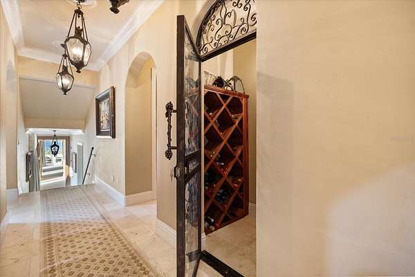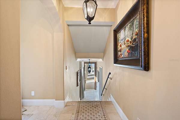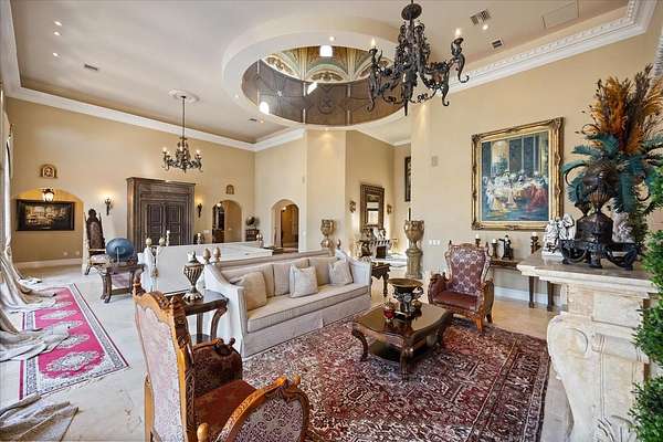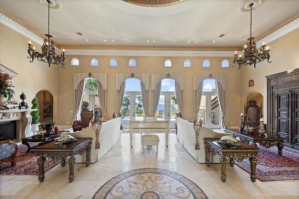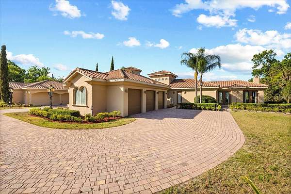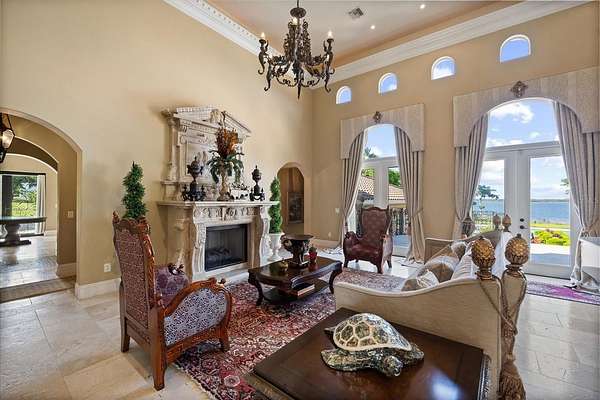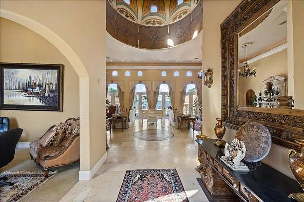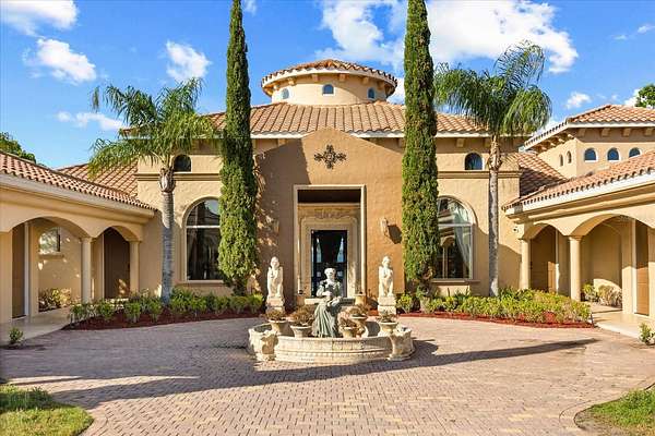 This exquisite lakefront property in Orlando offers a unique blend of luxury and charm, set on a generous 5.33-acre lot without HOA restrictions. The residence features an Italian-inspired exterior, complete with a front waterscape and vibrant gardens, creating an enchanting first impression. Upon entering, guests are welcomed by a grand foyer adorned with elegant marble details and a stunning 24 karat custom-painted dome.