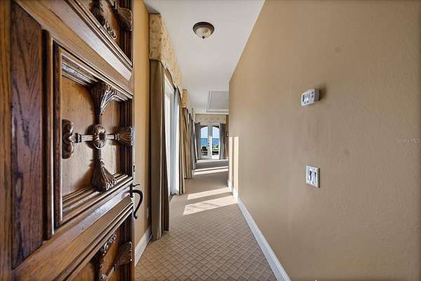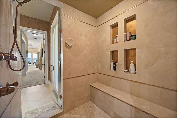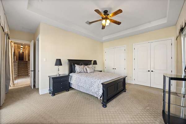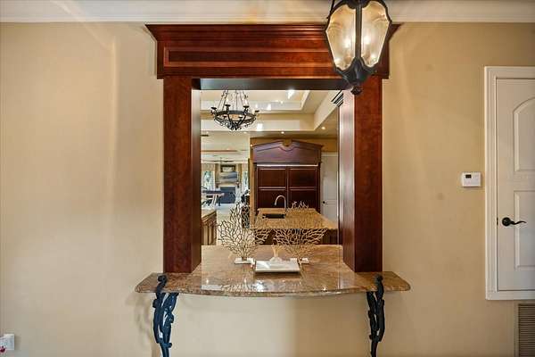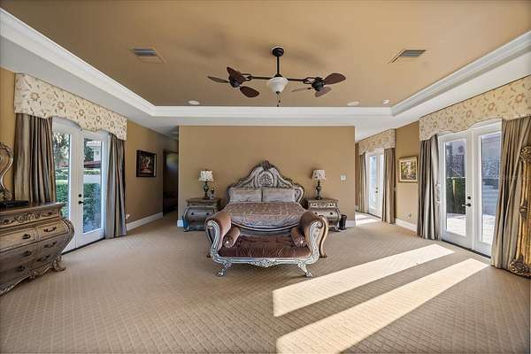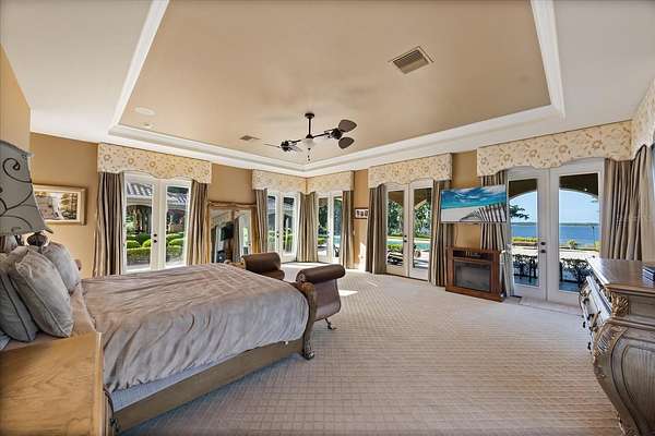 The expansive living area is designed for both comfort and elegance, featuring a grand marble fireplace, unique chandeliers, and panoramic views of Lake Jessup and the inviting pool. The thoughtfully designed "H" floor plan includes over 8,000 square feet of air-conditioned living space, with 5 spacious bedrooms and 6.5 bathrooms all conveniently located on one level.